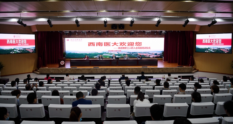 为关心关爱青年教职工成长,帮助新进教职工快速融入学校的工作和生活环境中,10月10日上午,人事处、校工会、教育评价与教师发展中心在城北校区第一学术报告厅联合举办了以“西南医大欢迎您”为主题的新进教职工入职入会岗前培训仪式。党委书记廖斌,主持行政全面工作副校长张春祥,党委副书记、工会主席刘毅,党委常委、副校长彭钢、何涛出席了仪式。二级院系及相关职能部门负责人、教师代表、新进教职工等近200人参加了仪式。