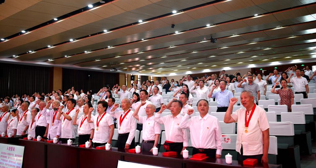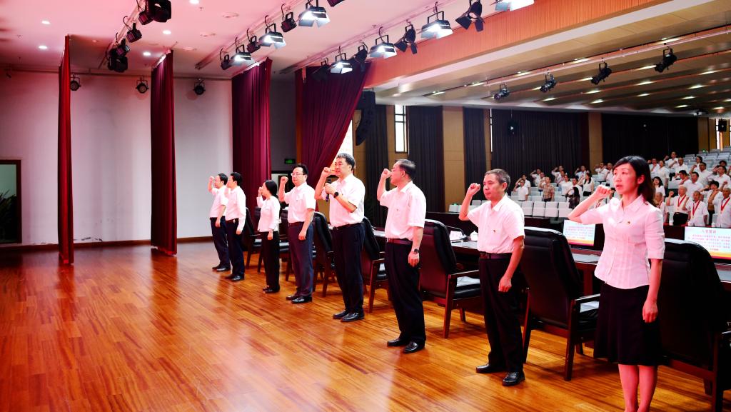 “我志愿加入中国共产党,拥护党的纲领,遵守党的章程……”在廖斌带领下,全体与会党员起立、举起右手,面对党旗重温入党誓词,许下共产党员的庄严承诺。