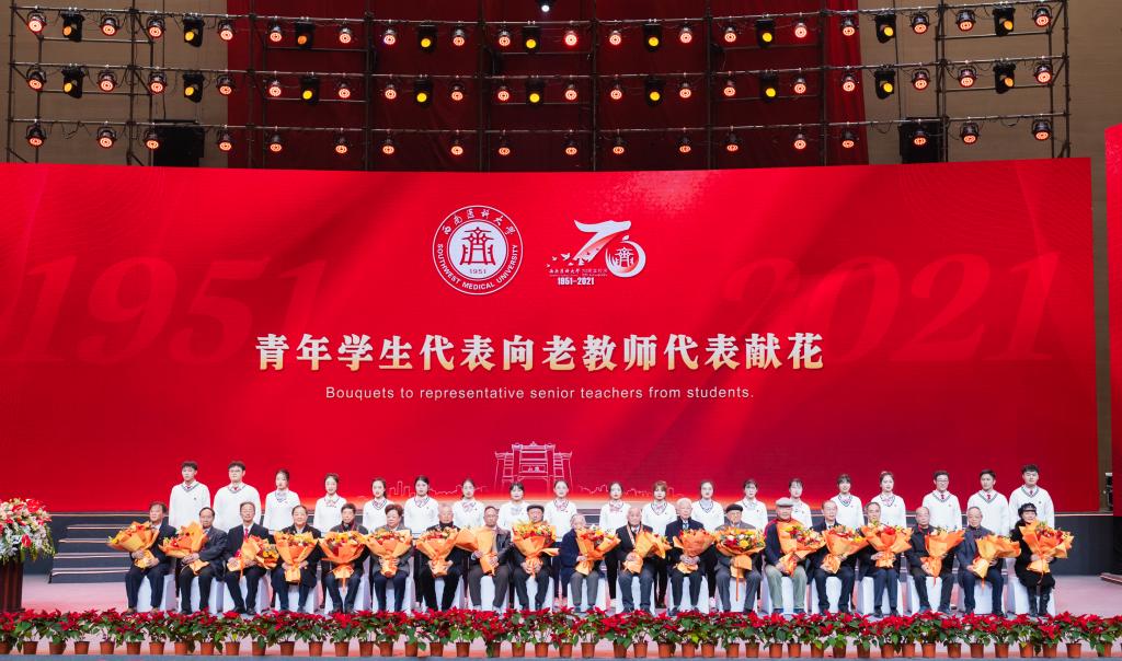 青年学生代表向老专家老领导代表献花,感谢老师的培养教诲,感谢一代代医大人为学校建设发展付出的艰辛、做出的重要贡献。