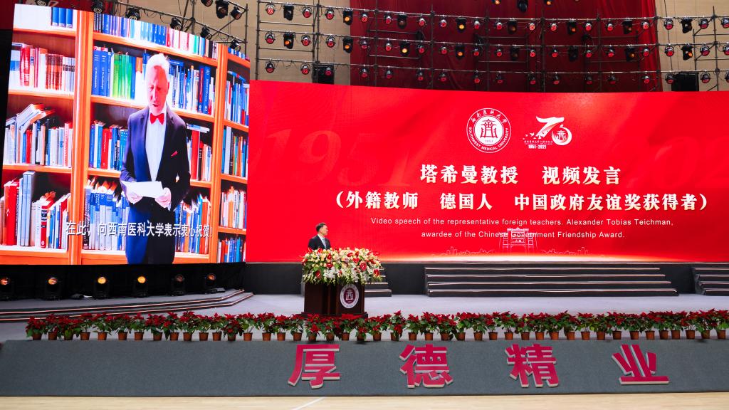 外籍教师代表、中国政府友谊奖获得者塔希曼教授视频发言。他谈道,kaiyun官方网站入口是中德高等教育交流合作的一个窗口和示范。自己将和学校的外籍教师一道,积极推进学校事业高质量发展,为提高川南地区人民的医疗服务水平,促进学校的教育国际化,增进中德两国人民的友谊贡献一份力量。