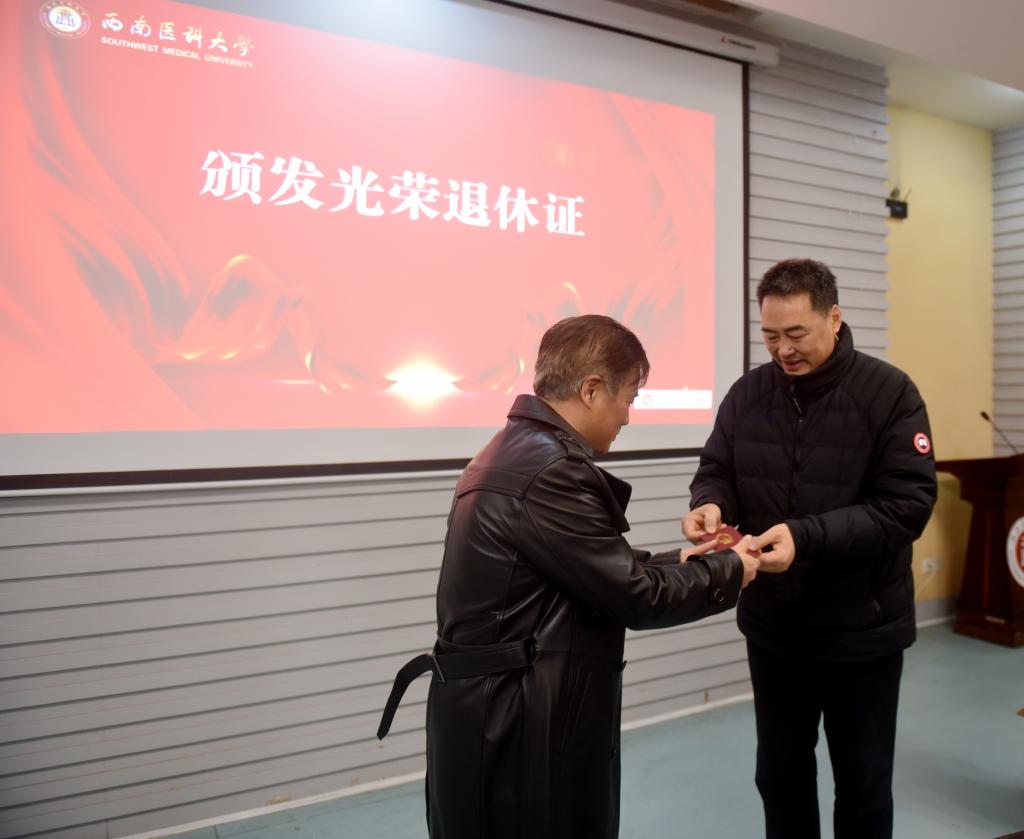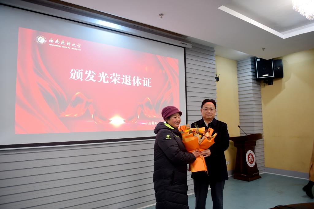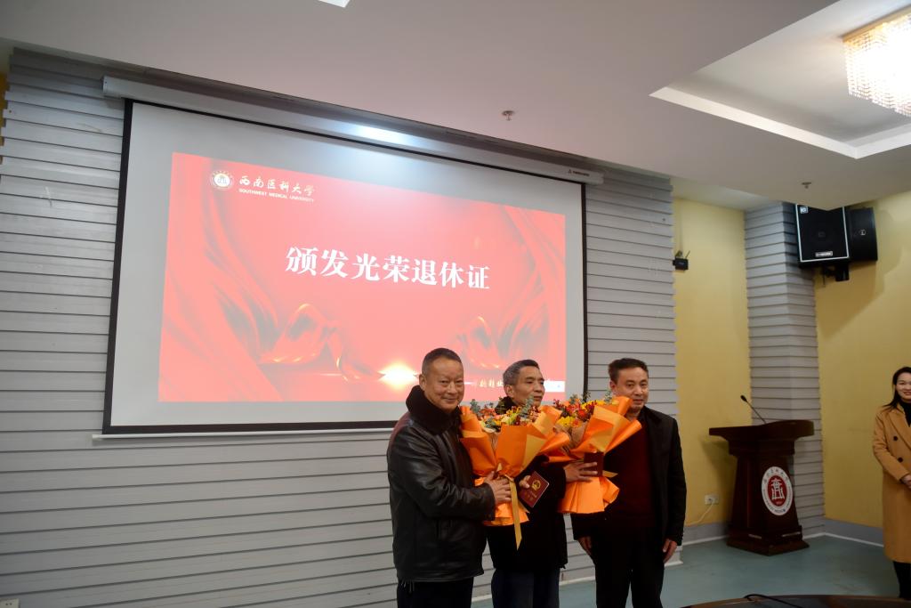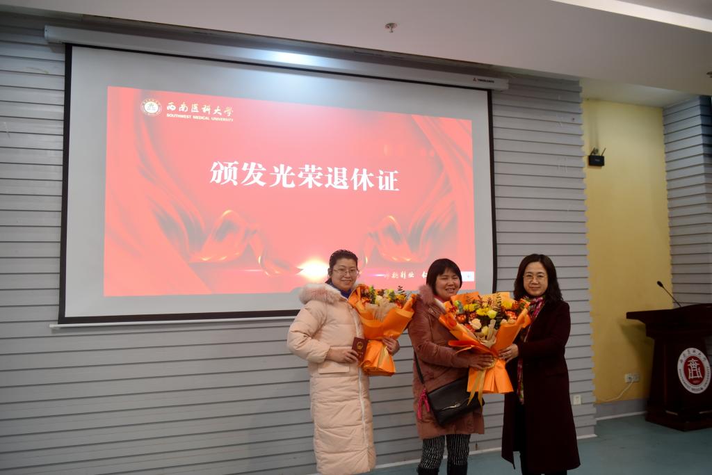 “百年华诞正青春,七秩风华薪火传,立德树人育桃李,祝福桑榆霞满天”。为进一步体现学校对退休教职工的关心关怀,表达对他们的崇高敬意和真诚感谢,12月31日下午,学校在城北校区第三会议室举行了“西南医大感谢您”2021年教职工荣退仪式。学校党委书记廖斌,党委副书记、校长张春祥,党委副书记、工会主席刘毅,副校长刘广益、彭钢,以及相关单位(部门)负责人,与2021年光荣退休的教职工一起参加了仪式。仪式由彭钢主持。