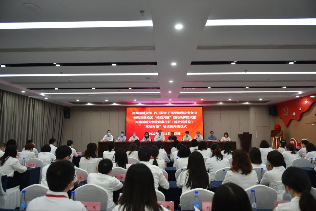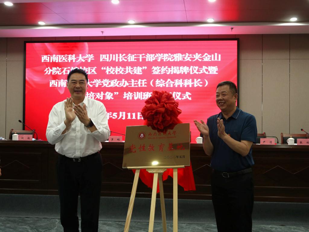 刘毅和石棉县委常委、组织部部长、党校校长朱国永签订合作协议,廖斌和罗刚共同为“校校共建”揭牌。朱国永为党政办主任(综合科科长)暨“双培对象”培训班负责人唐柯授旗。