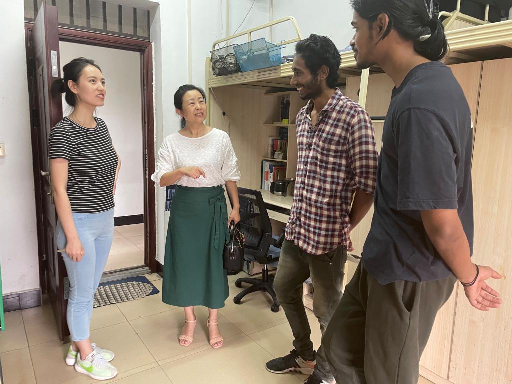 肖洁亲切问候了每位留学生,并仔细聆听同学们对新学期的展望,鼓励大家做好新学期的规划,努力学习,提高自己的专业水平,做到学有所得、学有所用。随后,领导和老师们检查了在校学生寝室的空调损坏情况,在核实空调均能正常使用后,肖洁嘱咐同学们在校期间注意用水用电安全,遵守学校疫情防控等相关规定。同学们对领导和老师们的关心与勉励表示感谢,并表示会在照顾好自己的同时,发奋努力,争取在新学期取得更好的成绩。