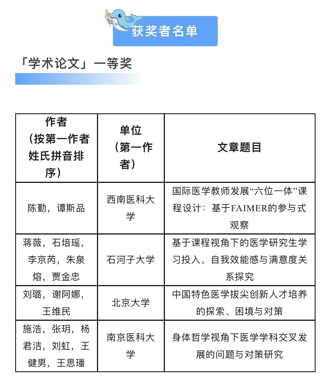 本着坚持质量第一和公开、公平、公正的原则,大会设立了由国内外医学教育专家构成的学术委员会指导秘书处按照相关规定和要求制定评审方案。经过函评、会审,评审委员会审议,在研究论文中评选出一等奖4篇,二等奖12篇,三等奖22篇,优秀奖31篇论文;实践项目中,评选出最佳实践20篇。
