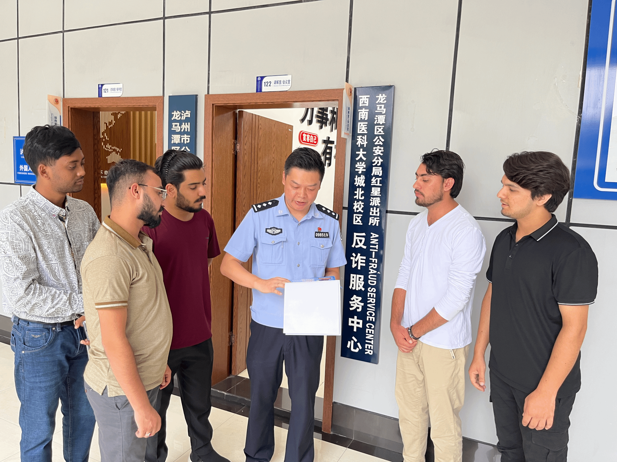 为进一步抓实校园反诈宣传,提高留学生的防骗意识,推进来华留学教育的安全稳定工作,国际教育学院联合泸州市公安局龙马潭区分局红星派出所深化“警校共建”为学生普及防范电信网络诈骗知识。