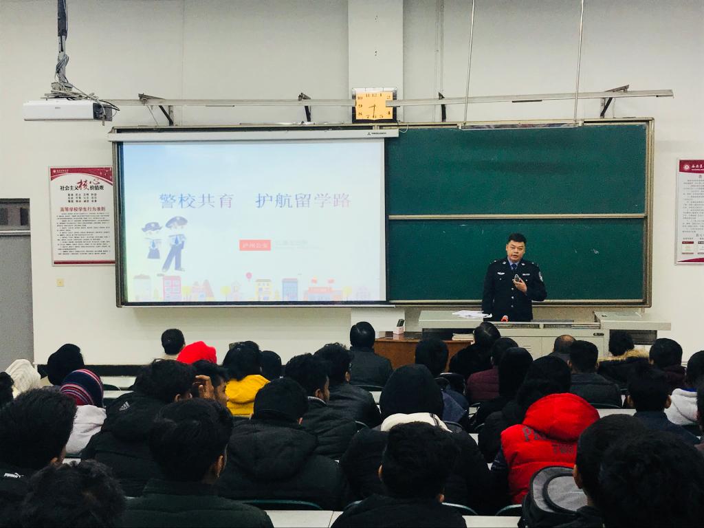 2019年1月11日学校保卫处与国际教育学院联合邀请了泸州市龙马潭区公安分局出入境大队和红星派出所涉外民警,对国际教育学院2018级留学生新生开展了主题为 “警校共育﹒护航留学路”的安全知识讲座。学校保卫处杜杰副处长、国际教育学院党总支书记李昌平、院长田耘、党总支副书记肖洁、泸州市龙马潭区公安分局出入境大队和红星派出所相关领导出席本次讲座,涉外民警冯警官和姜警官为学生做了详细的讲解。