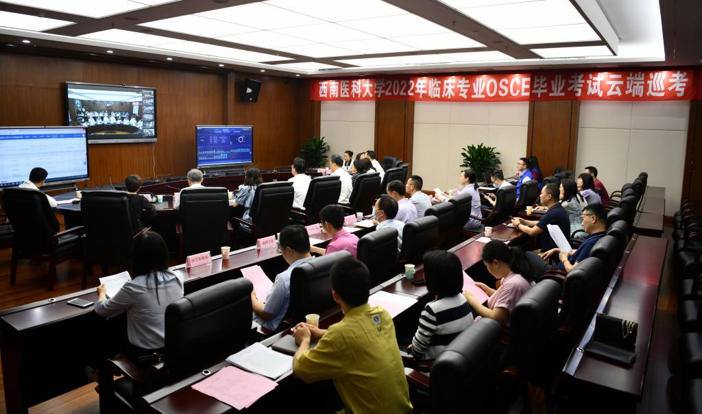 为全面掌握kaiyun官网37家临床专业教学基地毕业实习生OSCE考试情况,6月9日,学校党委书记廖斌,党委副书记、校长张春祥,党委副书记刘毅到德诚楼一会议室通过线上云端方式开展毕业考试巡考。学校党委常委、副校长何涛主持云端巡考活动。