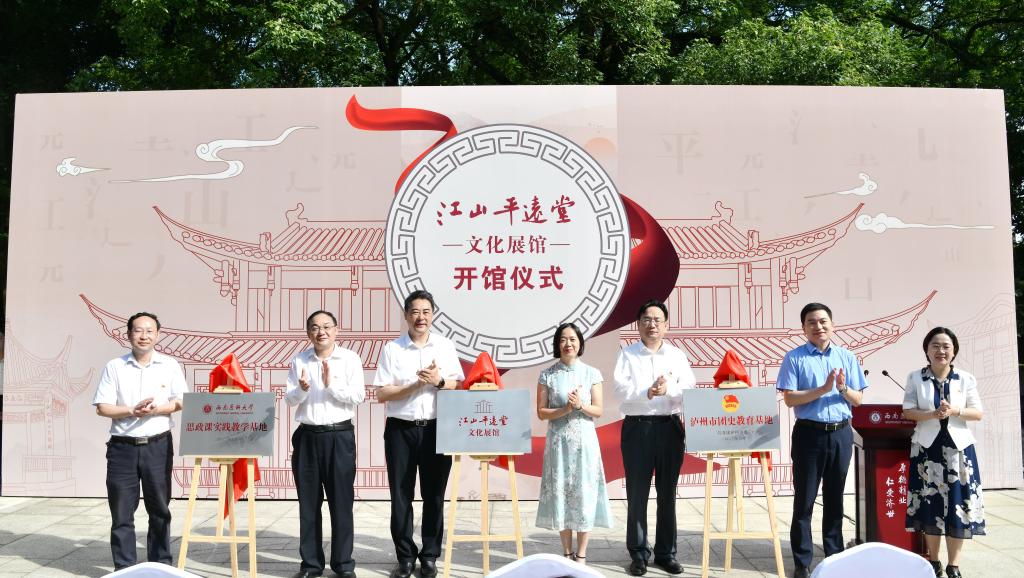 “平远江山四望开,飒然风至似兰台。”2018年,泸州市牵头重建江山平远堂,主体建筑完成后交由学校进行文化装饰打造。经过近一年的重新翻修外饰、布置内展,日前已完成打造。6月14日上午9时,明媚阳光之下,学校在忠山校区举行了江山平远堂文化展馆开馆仪式。泸州市委常委、宣传部部长徐利,共青团泸州市委书记陈波,泸州市文化广播电视和旅游局四级调研员杨红及有关部门同志,校领导廖斌、张春祥、李尚志、刘毅、聂敏海,学校相关职能部门负责同志,以及分团委(团总支)书记、“青马工程”学员和“忠山薪火”校园文化宣讲团成员代表参加了仪式。仪式由学校党委副书记刘毅主持。