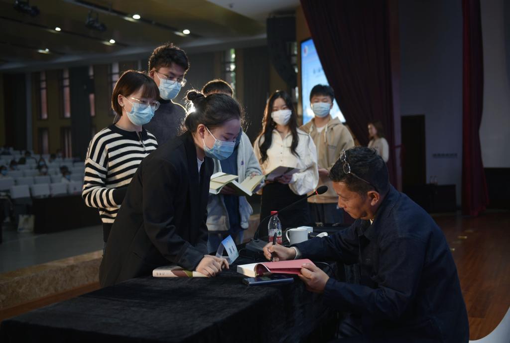 演讲结束之后,现场进行了互动。师生踊跃发言,积极提问。同时,阿来热情回答大家的提问,并为现场师生签书赠书,将现场气氛推至高潮。