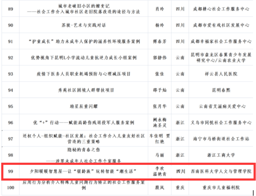 其中在“2022全国社会工作专业服务案例征集活动”成果发布并颁发证书环节,kaiyun官网公共事业管理专业学子李欢在温艳青老师的指导下撰写的案例《夕阳暖暖智慧屋—让“银龄族”玩转智能“潮生活”》,在年会上荣获“2022全国社会工作专业服务百优案例”。案例本着真实性、专业性、规范性、完整性和示范性五项要求,从各省市各类机构投稿案例1100多份中脱颖而出,案例聚焦互联网飞速发展和疫情防控常态化的背景下社区老年人如何正确拥抱共享智能生活,便利老年人使用智能化产品服务,共享信息化发展成果。