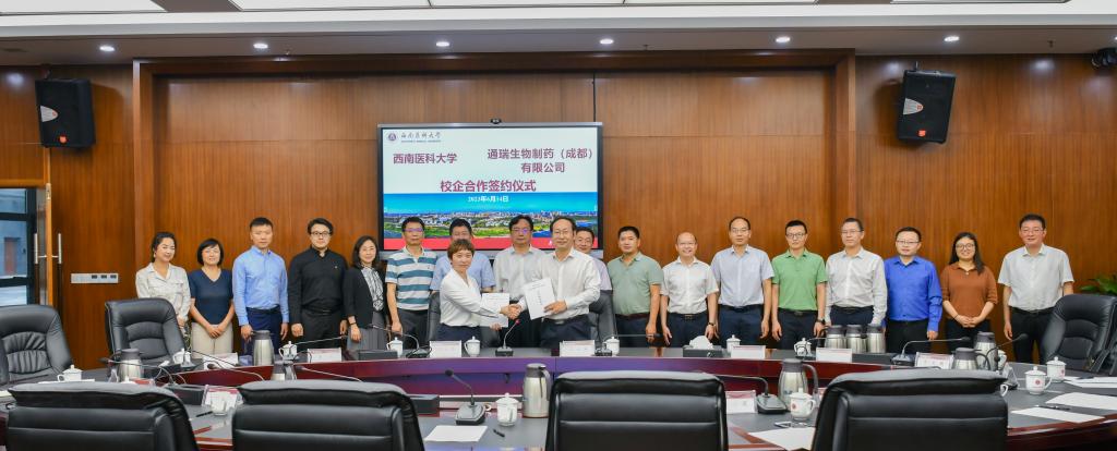 614日下午,学校与通瑞生物制药(成都)有限公司在城北校区第一会议室举行校企合作签约仪式。通瑞生物制药(成都)有限公司高管王巍一行,学校党委副书记、校长张春祥,党委常委、副校长聂敏海,教务处、科技处、研究生院、对外联络处、大学科技园管理办公室、附属医院、附属中医医院、药学院、附属医院核医学科等部门(单位)负责人出席了本次仪式。仪式由聂敏海主持。