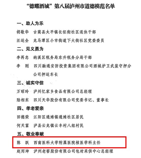 近日,泸州市精神文明建设委员会发布《“德耀酒城”第八届泸州市道德模范名单》,学校附属医院核医学科主任陈跃获评敬业奉献道德模范。