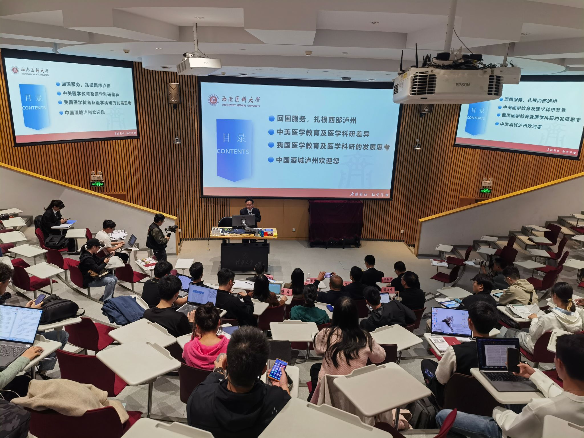 张春祥结合个人成长经历,从回国服务、扎根泸州谈到对中国未来医学教育及科学研究的个人思考。他在讲座中热情地向清华学子介绍泸州经济社会发展情况,诚挚邀请广大清华学子到泸州就业创业。张春祥校长还与清华学子进行互动交流。