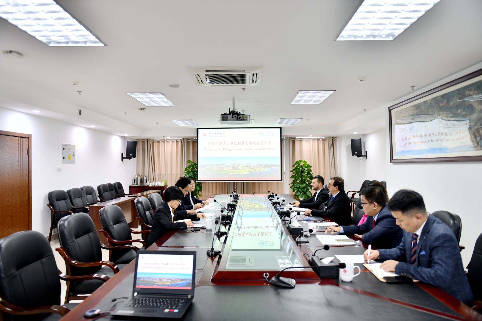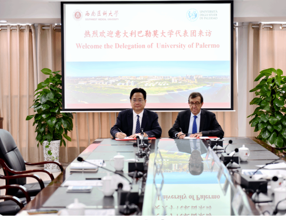 双方开展座谈交流并签署两校合作谅解备忘录。Mazzola Fabio副校长介绍了巴勒莫大学的基本概况,学科设置、对外交流等情况。他表示,巴勒莫大学也非常重视国际合作与发展,希望两校不断深化友谊,在医学健康领域推动务实合作。