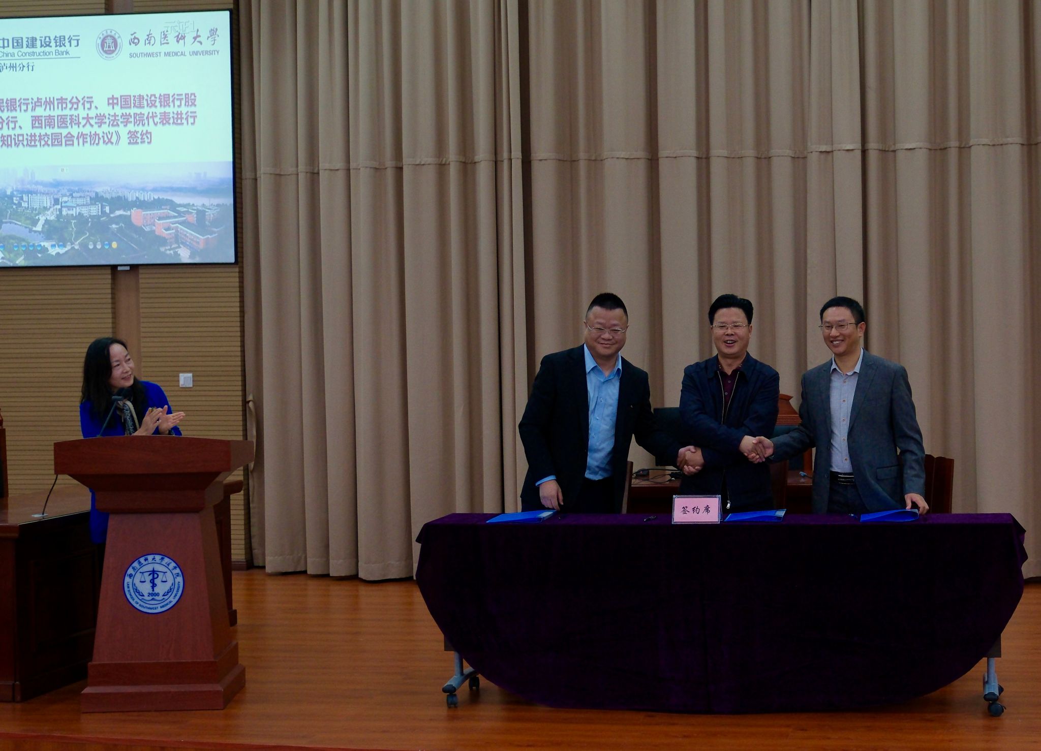 典礼上,中国人民银行泸州分行、中国建行泸州分行、kaiyun官方网站入口法学院三方签约《反洗钱知识进校园合作协议》。