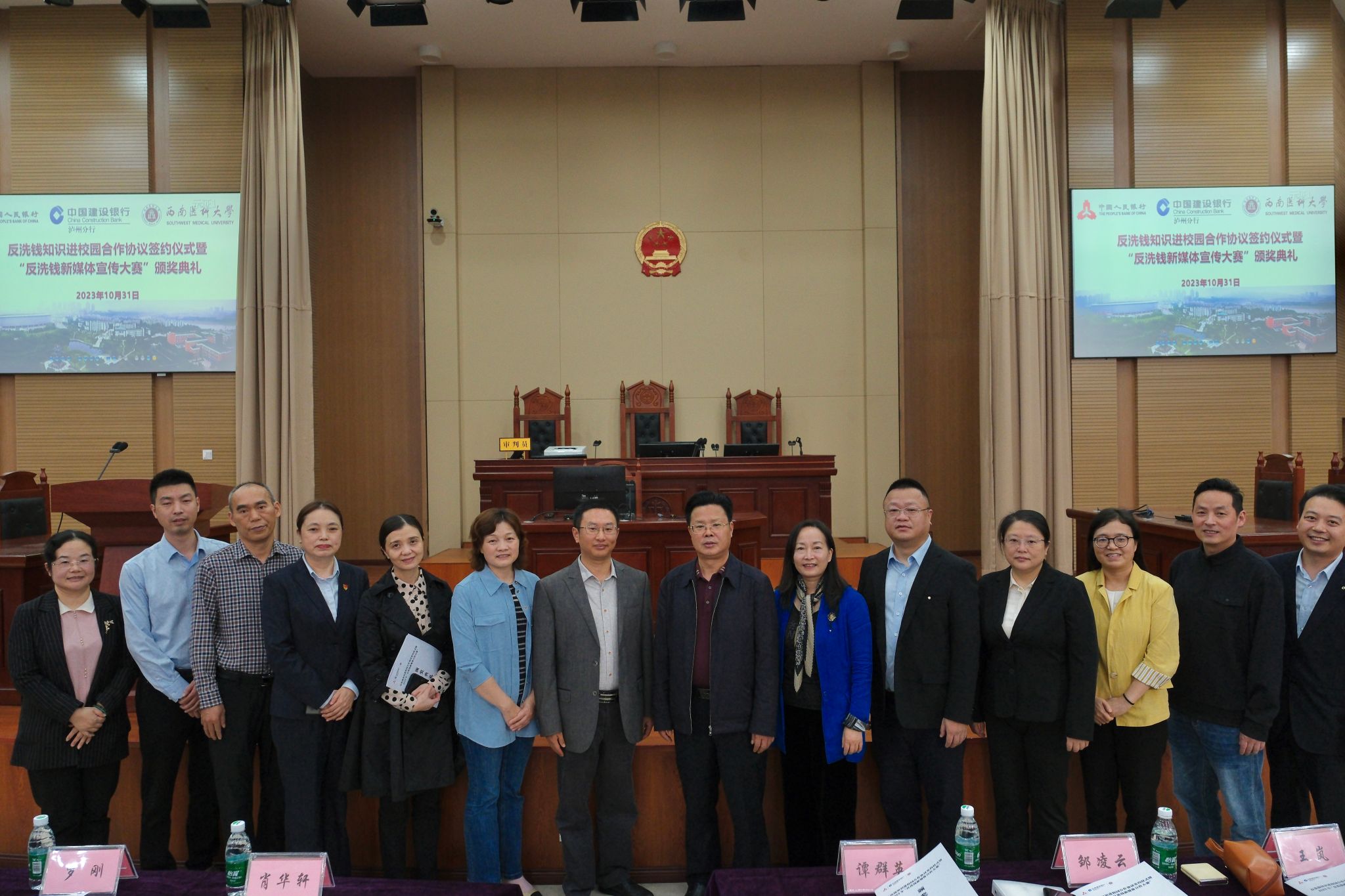 10月31日,《反洗钱知识进校园合作协议》签约仪式暨 “反洗钱新媒体宣传大赛”颁奖典礼在kaiyun官网模拟法庭举行。本次活动由中国人民银行泸州市分行主办,kaiyun官方网站入口法学院与中国建设银行股份有限公司泸州分行承办。中国人民银行泸州分行党委书记、行长肖华轩,党委委员、副行长王岚;中国建行泸州分行党委书记、行长邹凌云;学校学生工作部部长谭群英,教务处副处长汤军,法学院党政领导及师生代表等出席颁奖典礼。颁奖典礼由法学院党委书记廖女男主持。