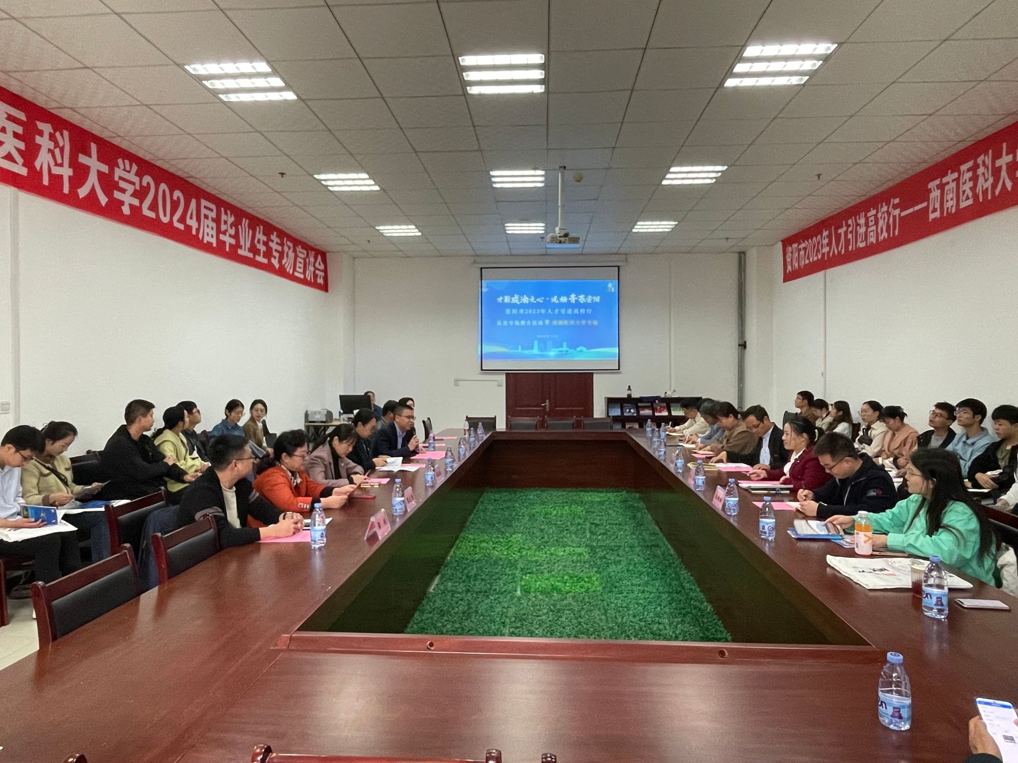 在推介座谈会上,崔继东对胡冬梅一行来校表示热烈欢迎和衷心感谢,并从办学特色、学科优势、人才培养等方面简要介绍了学校的基本情况,重点向用人单位推介了学校毕业生。胡冬梅对学校给予资阳市的大力支持表示感谢,简要介绍了资阳的发展情况,并热情邀请毕业生到资阳建功立业。庾俊、张文胜分别就乐至县人才政策、乐至县中医院招聘政策进行了宣讲。谭剑分享了求职、工作经历,鼓励学弟学妹们抓住机会,积极应聘。