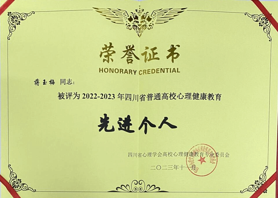 1117-18日,四川省心理学会高校心理健康教育专委会2023年年会在攀枝花学院举行。会议表彰了先进集体和个人,kaiyun官网荣获2022-2023年四川普通高校心理健康教育工作先进集体,学生心理健康教育与咨询中心蒋玉梅同志被评为先进个人。