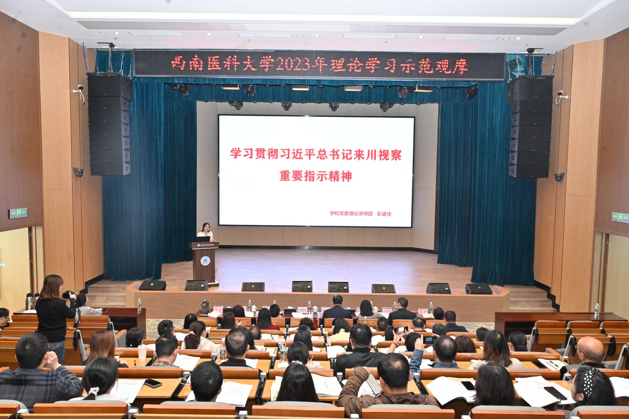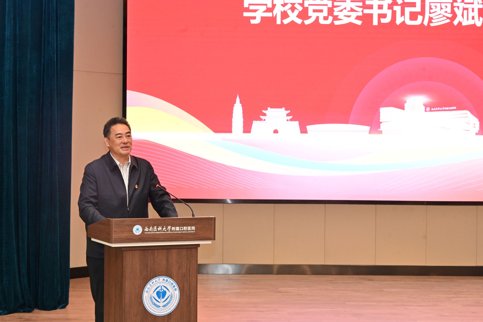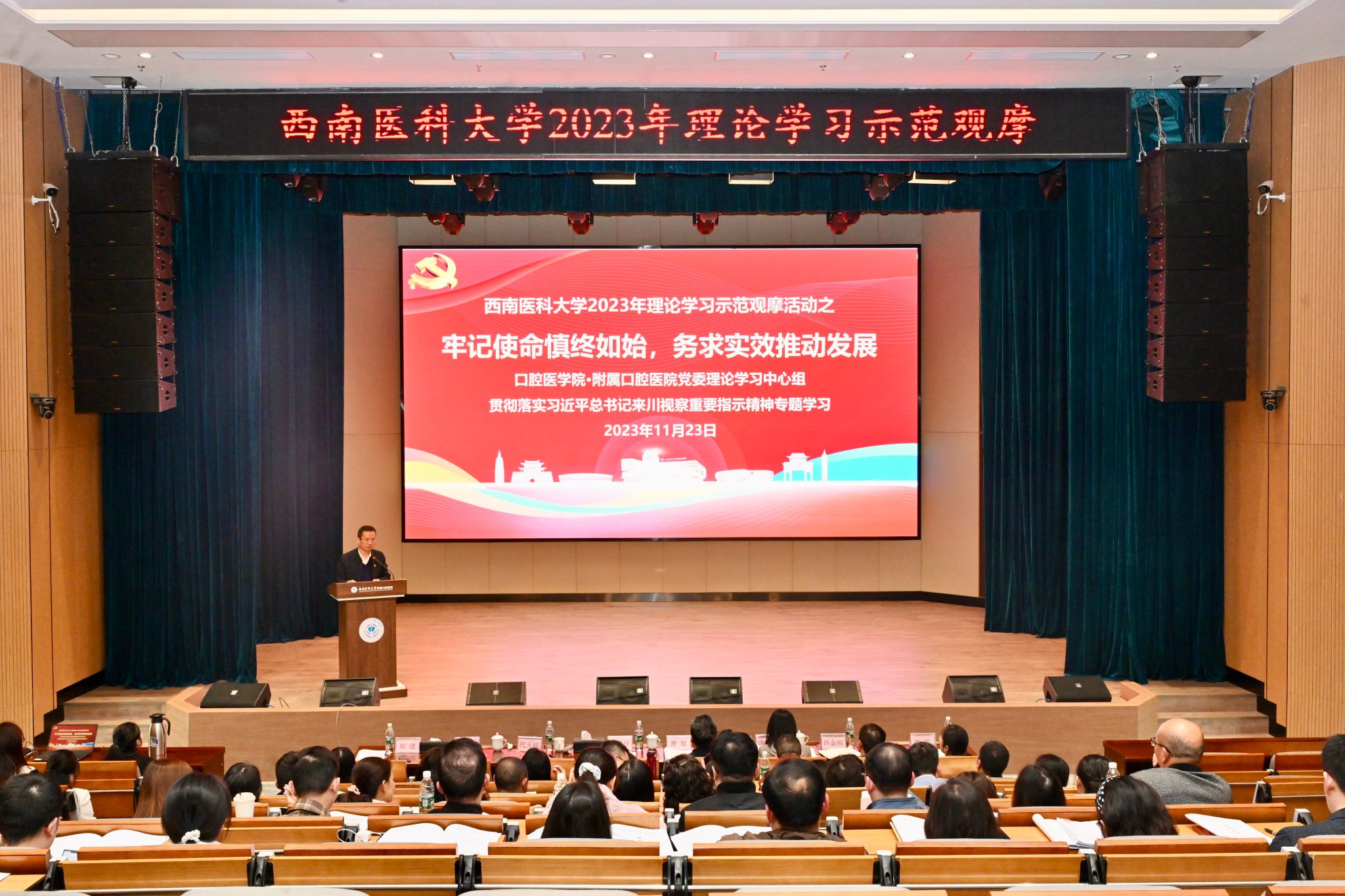 为深入学习贯彻习近平总书记来川视察重要指示精神,11月23日,学校2023年理论学习示范观摩活动在附属口腔医院云峰路院本部五楼学术报告厅举行。本次活动以“牢记使命慎终如始,务求实效推动发展——贯彻落实习近平总书记来川视察重要指示精神专题学习”为主题,由口腔医学院·附属口腔医院党委理论学习中心组作示范学习。学校党委书记廖斌列席旁听,党委宣传部·统战部副部长唐开秀以及各二级党组织负责人出席观摩活动;口腔医学院·附属口腔医院党委理论学习中心组成员,党支部书记、职能部门主要负责人参加专题学习。会议由学校口腔医学院·附属口腔医院党委书记、中心组组长代天祥主持。