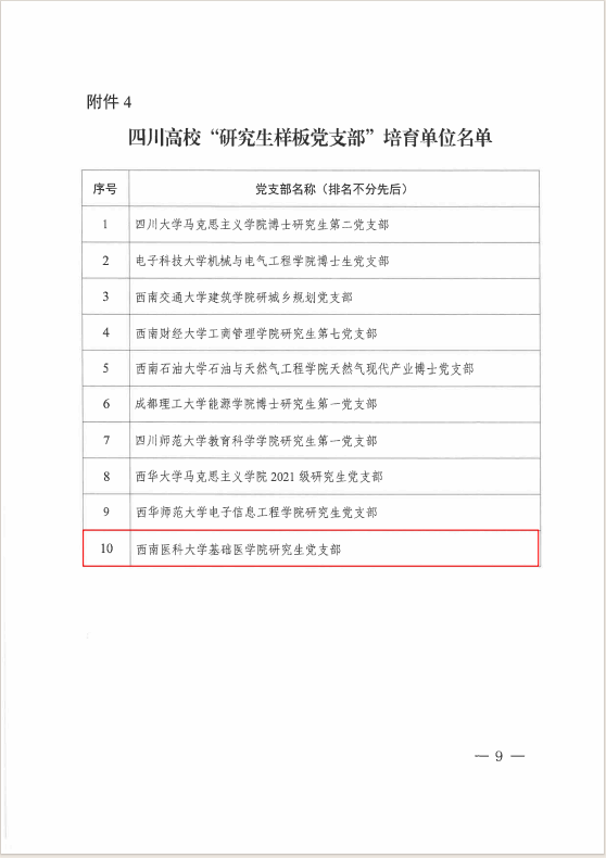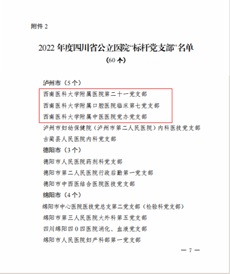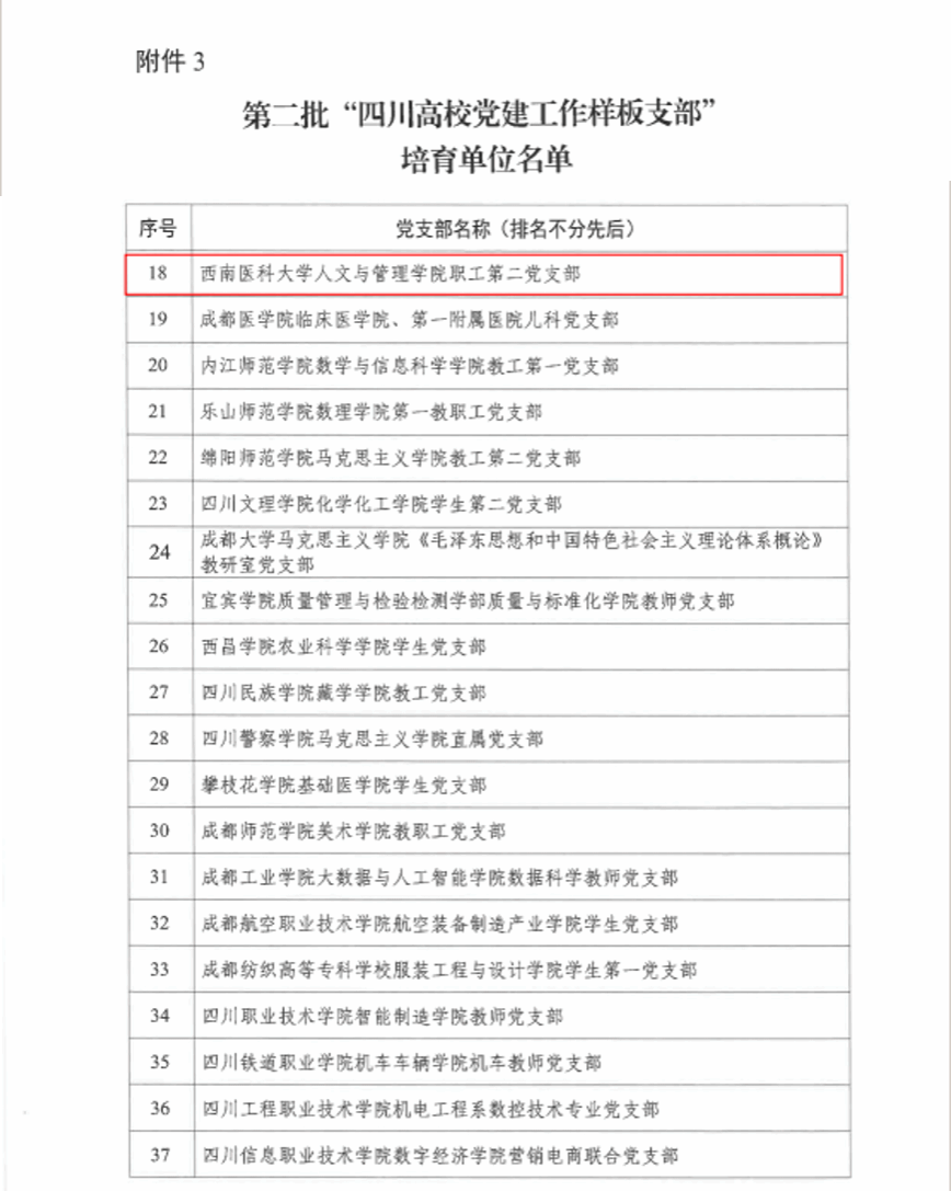 近日,省委教育工委公布第二批新时代四川高校党建示范创建和质量创优工作遴选结果,kaiyun官网人文与管理学院职工第二党支部入选第二批“四川高校党建工作样板支部”培育单位,基础医学院研究生党支部入选“四川高校研究生样板党支部”培育单位。同时,省委组织部、省卫健委开展“党建工作示范医院”和“标杆党支部”培育创建活动,kaiyun官网附属医院第二十一党支部、附属口腔医院临床第七党支部、附属中医医院党办党支部成功入选。