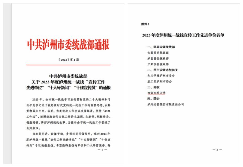 学校统战工作坚持以习近平新时代中国特色社会主义思想为指导,深入学习贯彻习近平总书记关于做好新时代党的统一战线工作的重要思想,认真落实中央、省委和学校党委的各项决策部署,广泛凝聚共识,全力服务发展,擦亮工作品牌,在守正创新、应变求变、提质增效等方面取得了良好成效。近年来,党委统战部积极拓展网络统战工作阵地,上线官方微信公众号,主动讲好西南医大统战故事,2023年发布统战工作信息近40篇,其中在人民网、中新网、四川人大网、同心四川等省级及以上媒体平台刊发27篇,有效提升了学校统战工作的传播力、引导力和影响力。