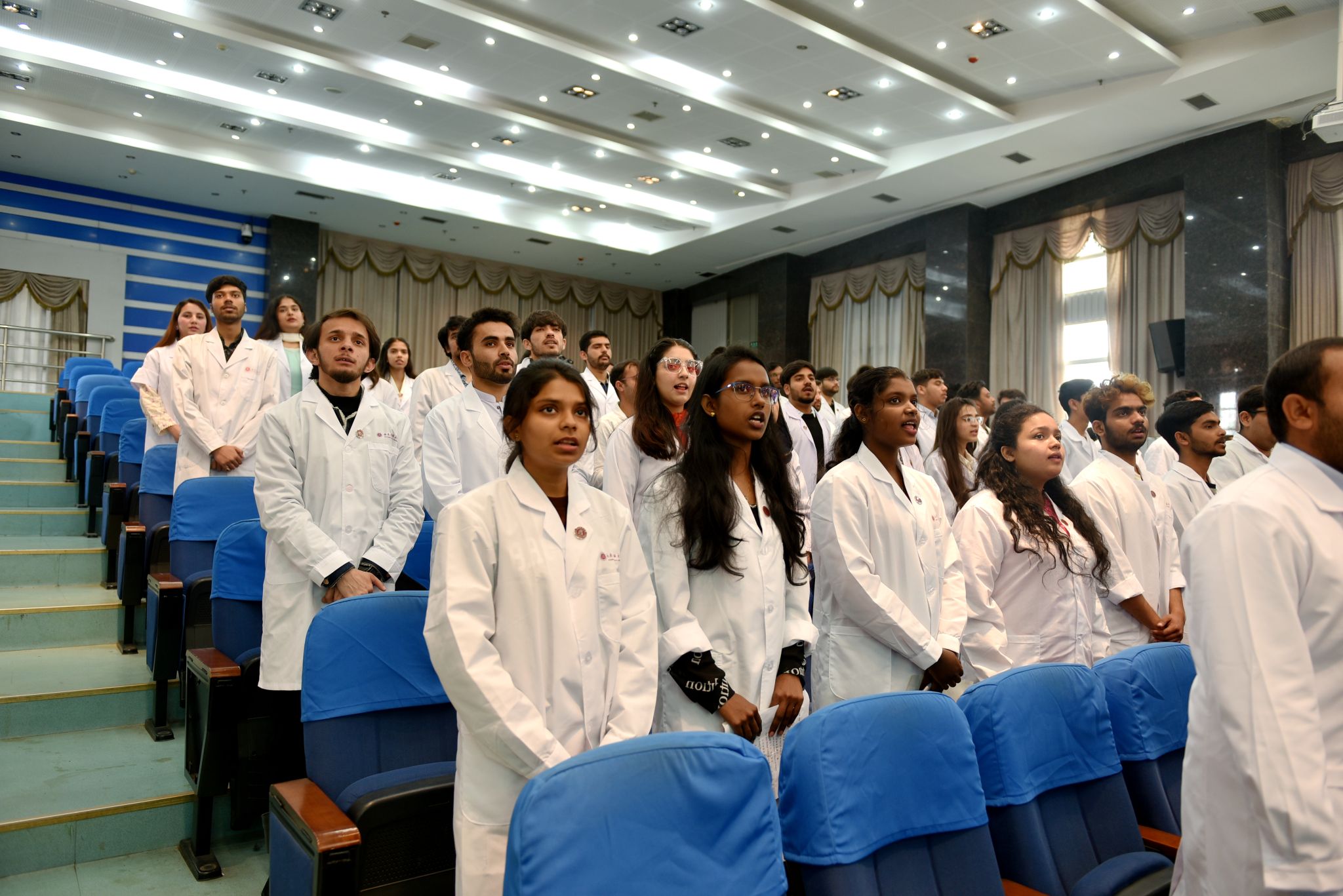 代荣阳代表学校对来校求学的来华留学新生表示热烈的欢迎和诚挚的问候,并寄语来华留学新生。他指出,来华留学生要坚定理想信念,勤于学习,攀登医学高峰;要牢记医学使命,敏于求知,守护人类健康;要开创卓越未来,拼搏奋进,成就理想人生。