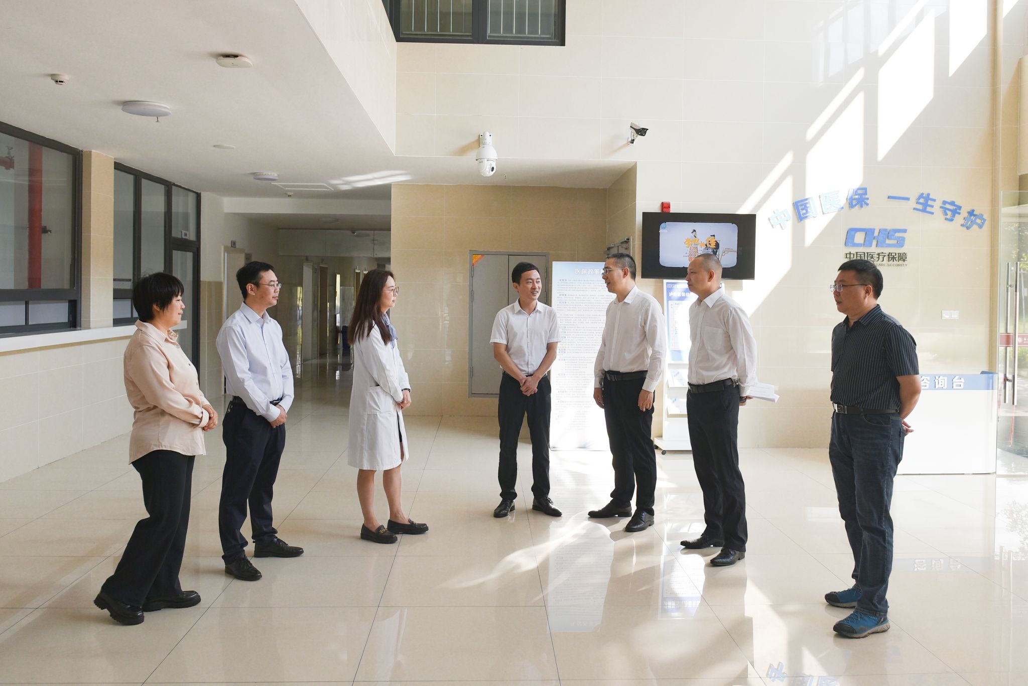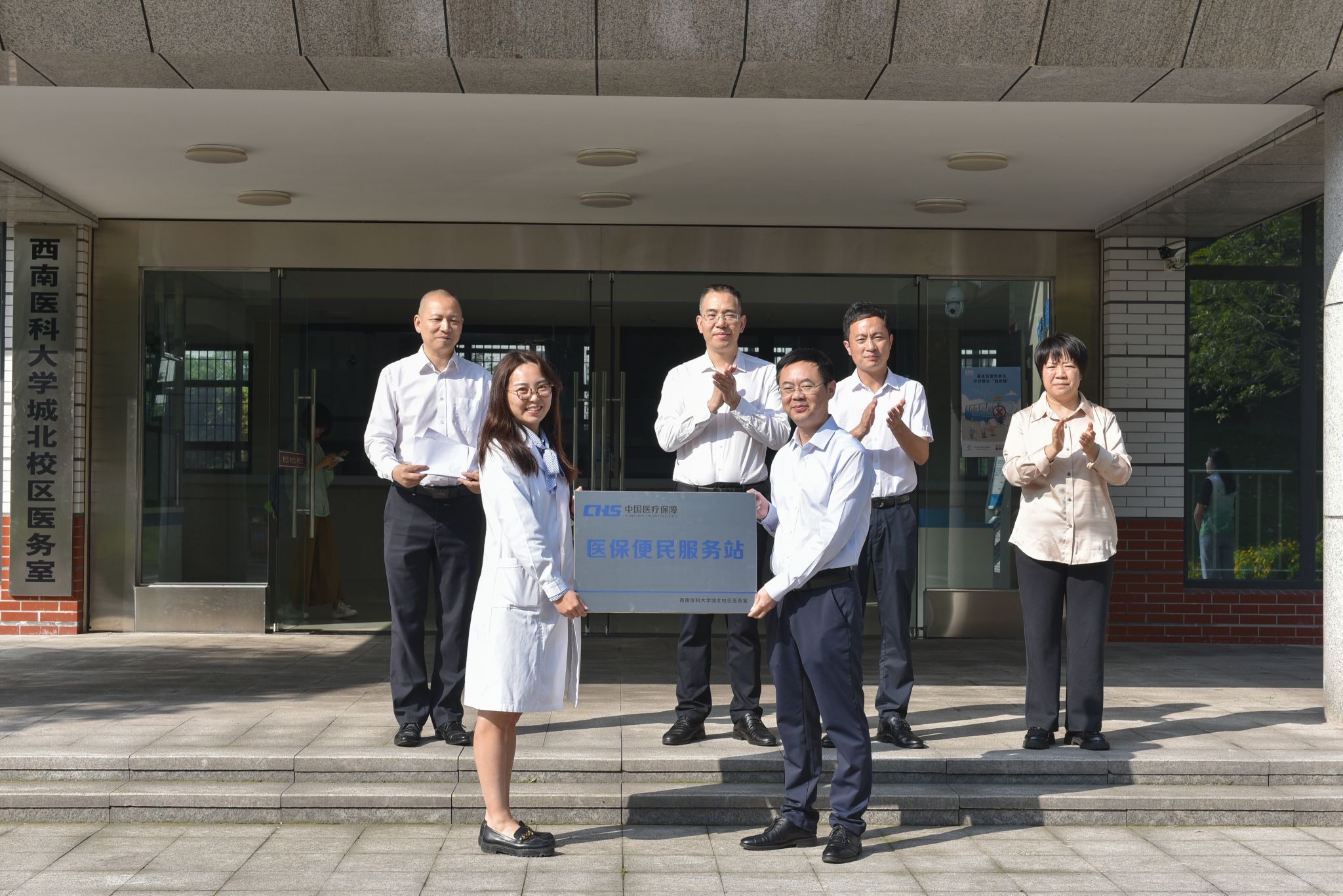 426日上午,泸州市医保局党组成员、机关党委书记周荣,江阳区医保局党组书记、局长任端,龙马潭区医保局党组书记、局长叶昌彬一行来校授予校医院医疗保障定点医疗机构医保便民服务站牌匾。学校党委常委、副校长赵领参加相关活动。