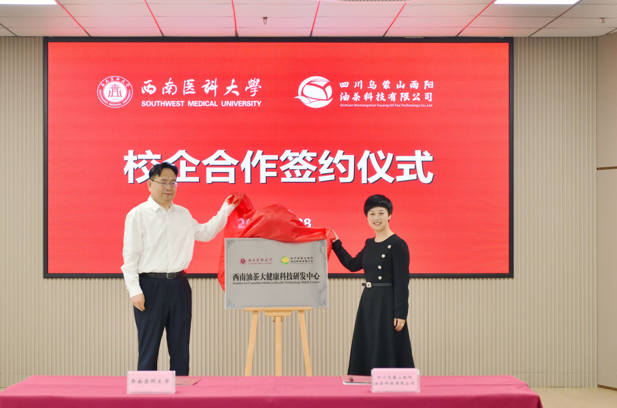 628日上午,学校与四川乌蒙山雨阳油茶科技有限公司校企合作签约暨西南油茶大健康科技研发中心揭牌仪式在双创大楼科创厅举行。学校党委副书记、校长张春祥,党委常委、副校长聂敏海,四川乌蒙山雨阳油茶科技有限公司董事长龙梅,副总经理李忠源等出席仪式。