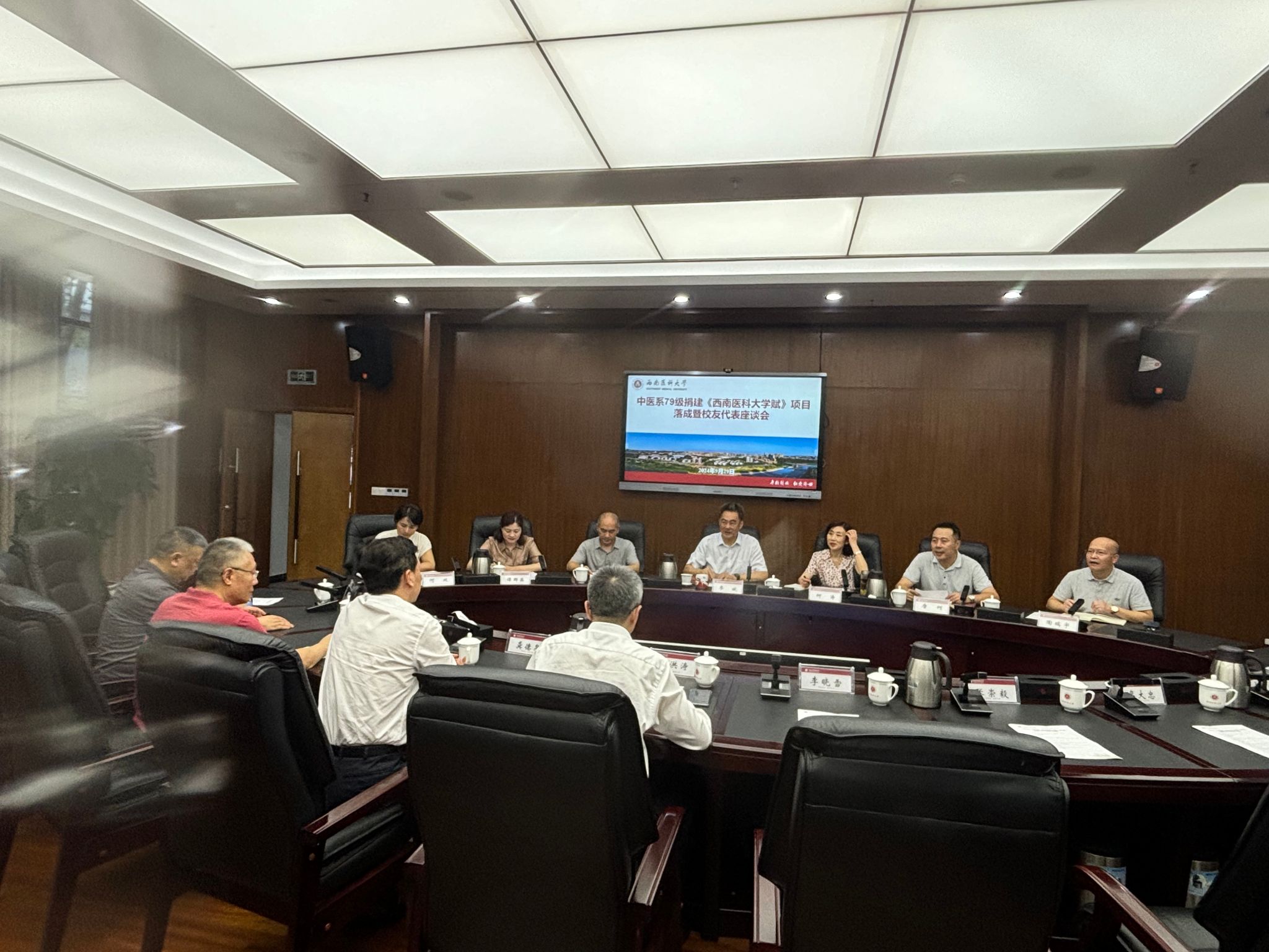 9月29日下午,中医系79级捐建《kaiyun官方网站入口赋》项目落成暨校友代表座谈会在城北校区第一会议室召开。学校党委书记廖斌,党委常委、副校长何涛,中医系79级校友、重庆华森制药股份有限公司党委书记、董事长游洪涛,中医系79级校友,绿叶制药集团四川绿叶制药股份有限公司董事长龚德泉出席,党政办公室·目标督查办公室·信访办公室、宣传部·统战部、学生工作部(处)·招生就业处·学生资助管理中心、发展规划处、对外联络处等部门领导参会。会议由何涛主持。