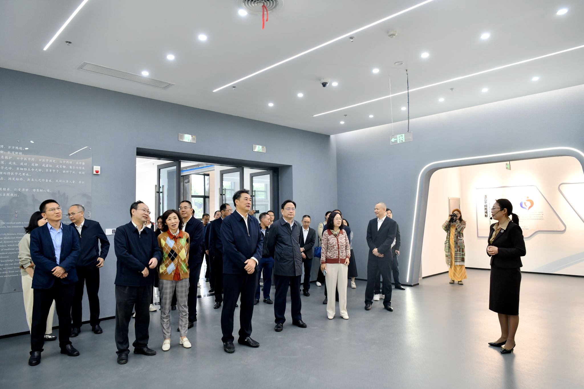 廖斌一行走进项目现场,先后实地查看了无纸化标准考场、多站式一体化考场、内科实训中心、模拟手术室、外科综合实训室、医学博物馆等处,详细了解项目设计施工、功能布局、实践教学设备采购进展以及下一步的教学投用计划等方面情况。