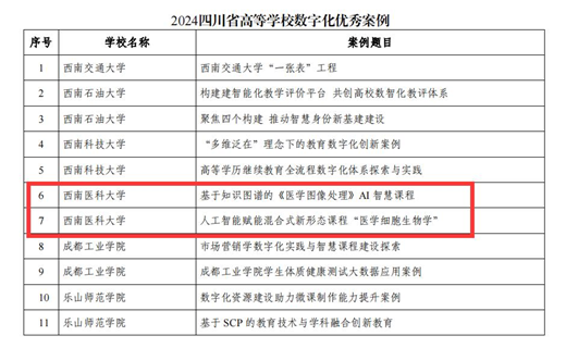 近日,四川省高等教育学会教育信息化专业委员会公布了2024年四川省高等学校数字化优秀案例,全省高校共36个案例入选,kaiyun官网《基于知识图谱的<医学图像处理>AI智慧课程》《人工智能赋能混合式新形态课程医学细胞生物学》入选。