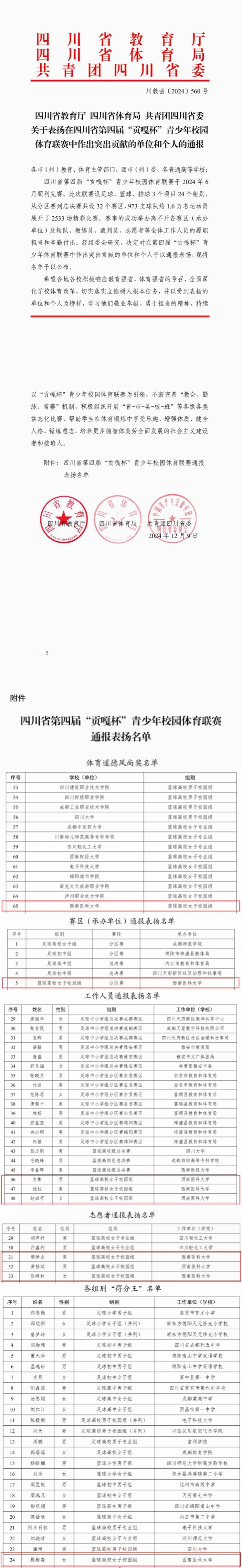 近日,四川省教育厅、四川省体育局、共青团四川省委发布第四届“贡嘎杯”青少年校园体育联赛通报表扬。作为此次联赛篮球高校女子校园组分区赛的承办单位,学校获得了多项通报表扬。其中,学校获评体育道德风尚奖和优秀承办赛区,左彬、桂柱、赵四可获评“优秀工作人员”,樊世吉、黄杨斌、张峰林获评“优秀志愿者”,殷梅森获“得分王”。