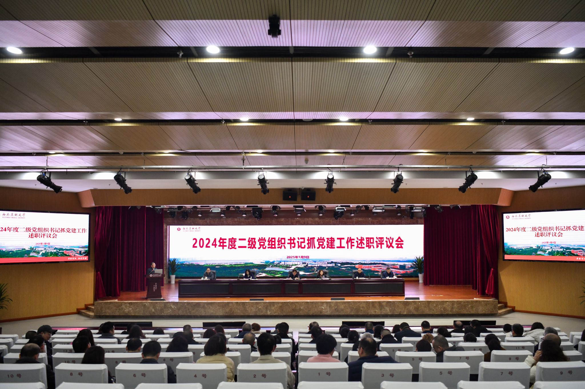1月9日下午,学校在城北校区第一学术报告厅召开2024年度二级党组织书记抓基层党建工作述职评议考核会。在校校领导,党委常委,党委委员、纪委委员,二级党组织书记,临床医学院·附属医院党委、中西医结合学院·附属中医医院党委下辖党总支书记参加会议,中层行政正职干部(含主持工作)列席会议。校党委书记张春祥主持会议。