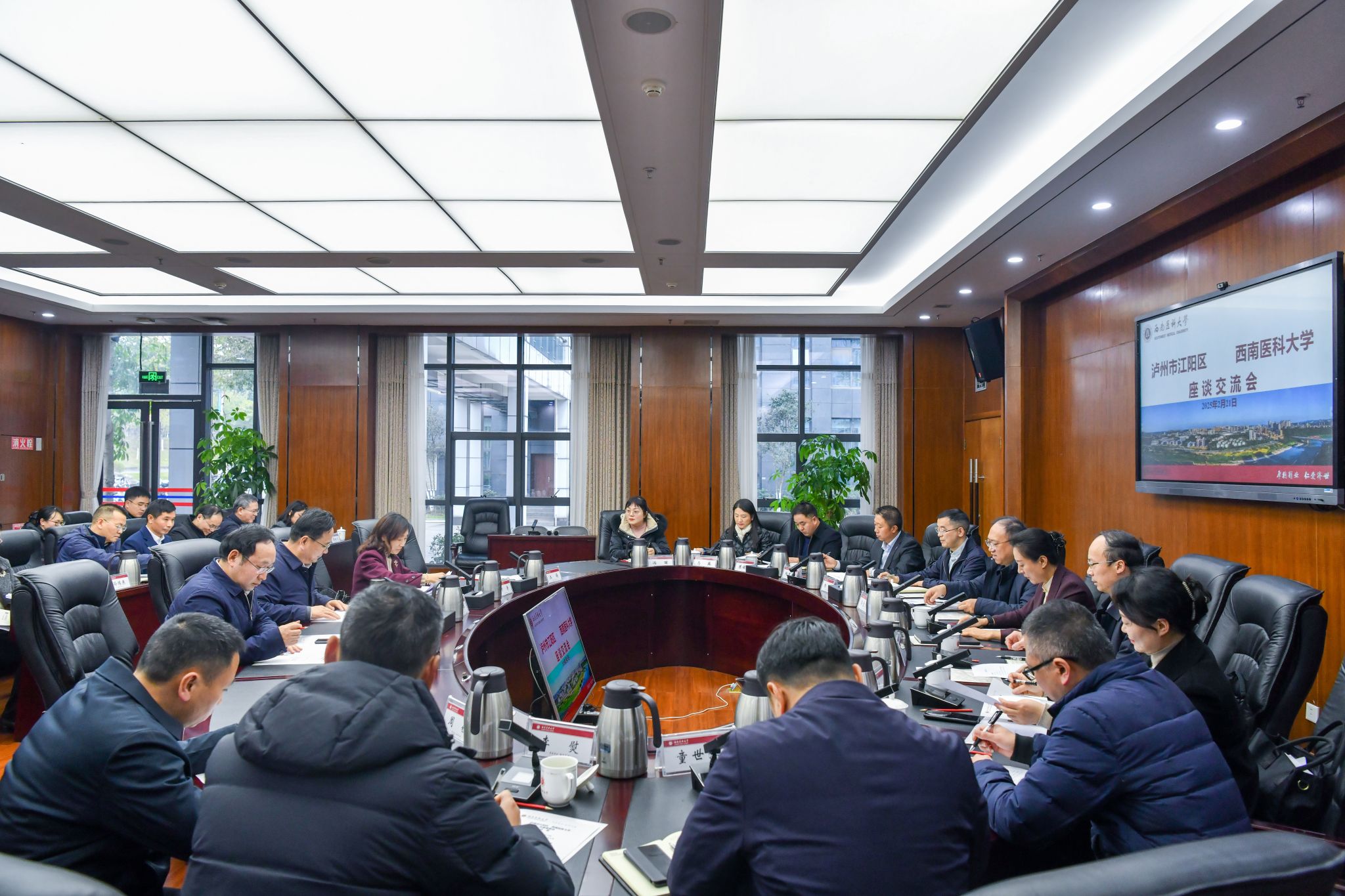 学校党委副书记、校长何涛对江阳区委、区政府一行的到来表示欢迎,并介绍了学校近年来在医教研各方面取得的进展。袁瑞就江阳区整体发展状况及医药健康产业链发展情况进行了介绍。