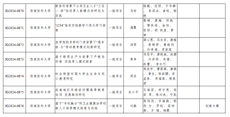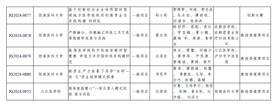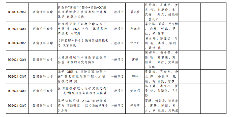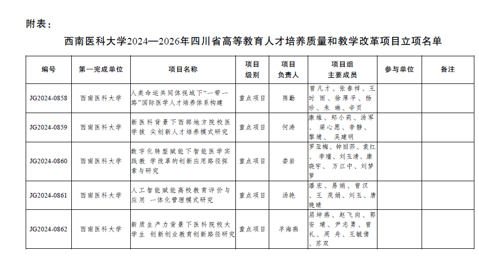 近日,四川省教育厅公布了2024--2026年四川省高等教育人才培养质量和教学改革项目立项名单。kaiyun官网组织申报的《人类命运共同体视域下一带一路国际医学人才培养体系构建》等24个项目获批立项,其中重点项目5项,一般项目18项,参与项目1项。