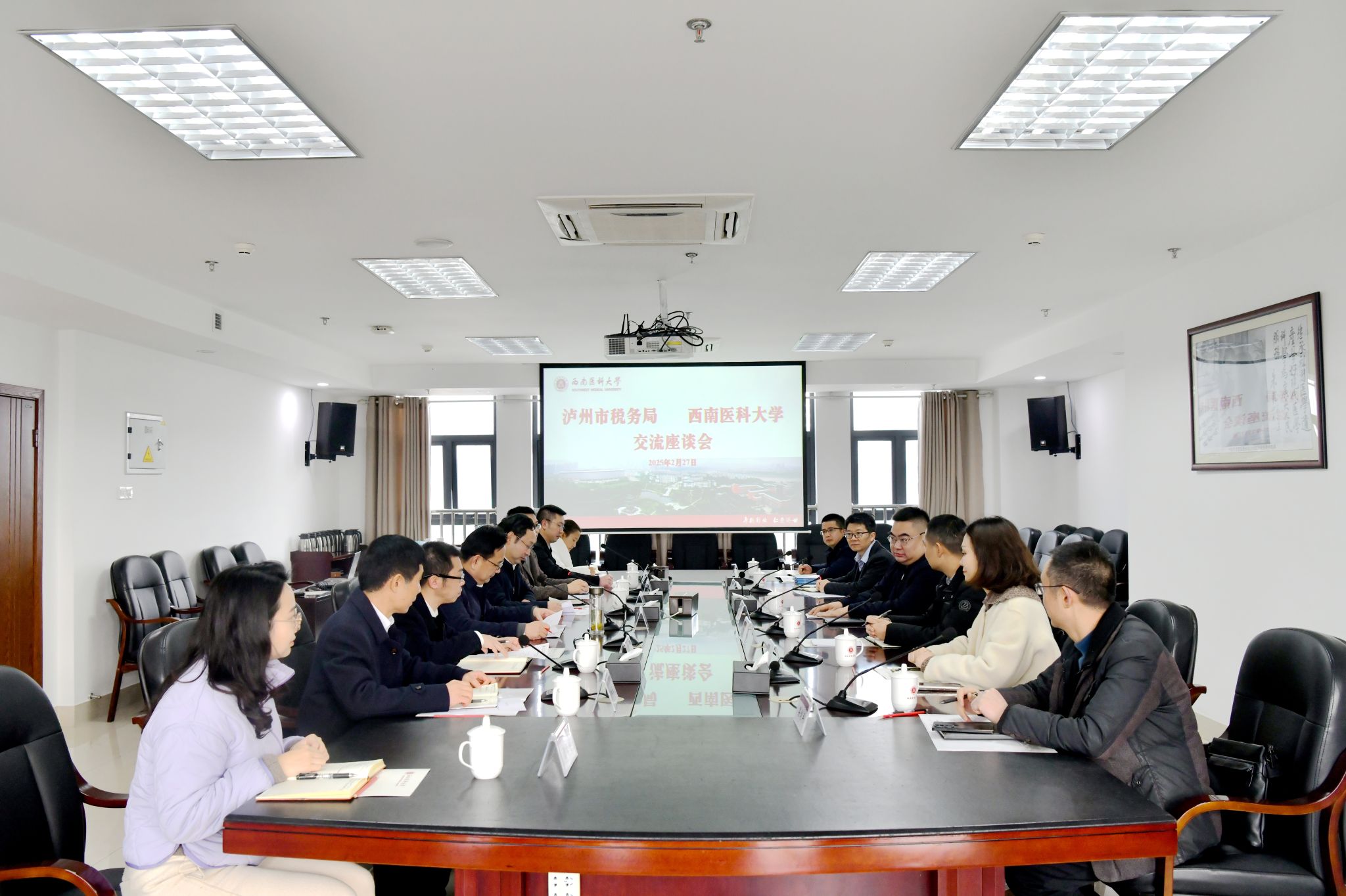 泸州市税务局办公室主任罗雨,社会保险费科科长易飞、第二税务分局局长李佳璇、税收宣传中心主任文练、第一税务分局局长梁剑平,学校党政办公室、发展规划处、财务管理处相关负责人参加会议。
