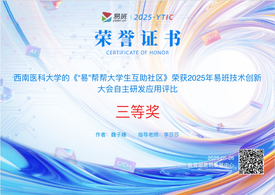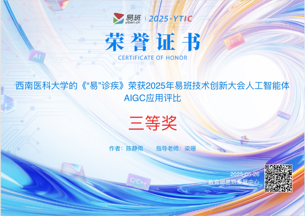 大会上,kaiyun官网学子申报的4个参赛作品均获奖。魏子峰同学的作品《“易”帮帮大学生互助社区》凭借其创新的社区互助模式和实用功能,荣获“自主研发应用类”三等奖;李瑞康、周洁等同学的作品《心屿“易”境:医学生云端疗愈站》,以独特的创意和对医学生群体需求的精准把握,斩获“创新创意方案类”三等奖;陈静雨同学的作品《“易”诊疾》,将智能体AIGC技术巧妙应用于疾病诊断辅助,获得“智能体AIGC应用”三等奖;毛丽蓉、刘紫研等同学的作品《智渡赤水——小川的VR长征密码》,借助虚拟现实技术重现长征场景,以沉浸式体验讲述红色故事,夺得“虚拟现实技术应用”三等奖。