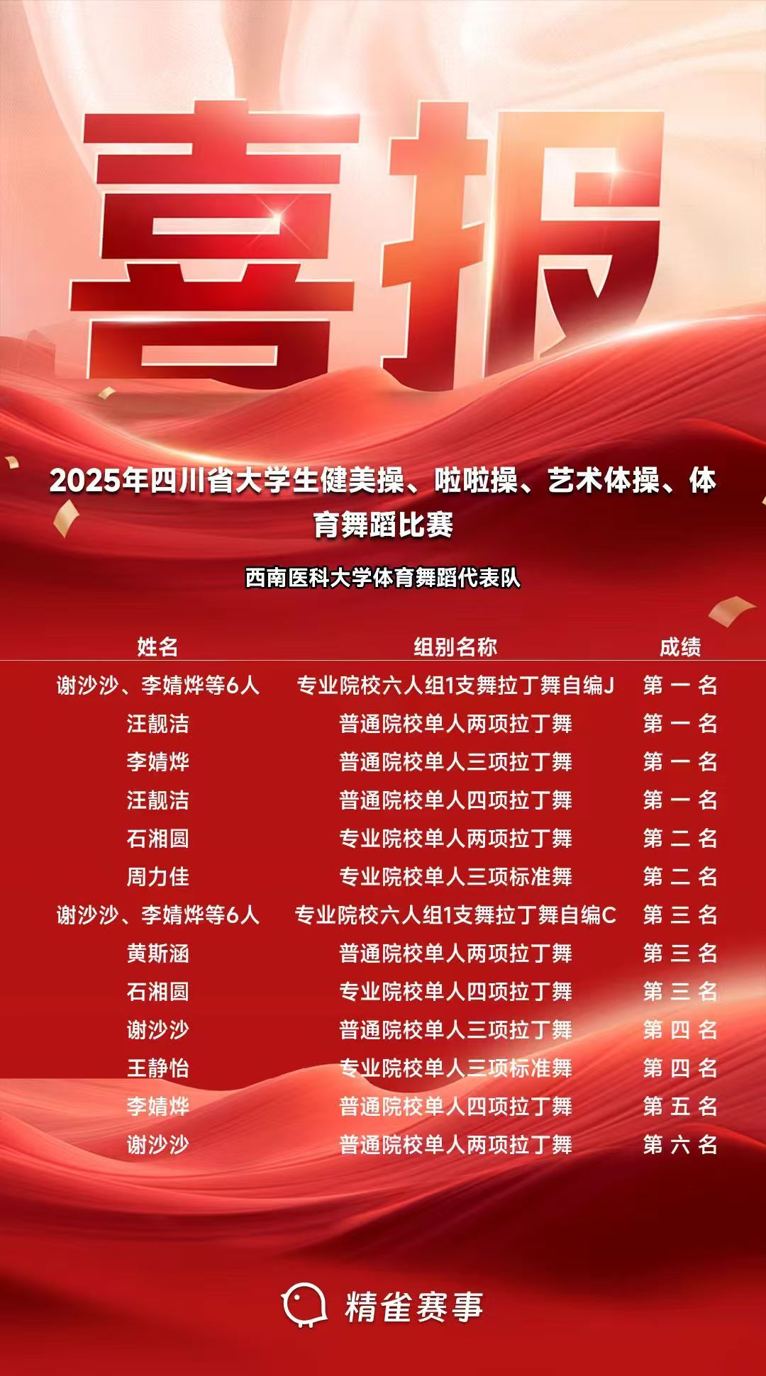 经过三天紧张激烈的角逐,kaiyun官方网站入口参赛代表队不负众望,载誉而归。由临床医学院、体育学院、法学院等8名本科生、研究生组成的队伍,凭借扎实的功底与出色的发挥,斩获4个第一名、2个第二名、3个第三名、2个第四名、1个第五名、1个第六名的佳绩。其中,谢沙沙、李婧烨等6人在专业院校六人组1支舞拉丁舞自编J项目中脱颖而出,获第一名;法学院汪靓洁在普通院校单人两项和单人4项比赛中一路过关斩将,连夺两个冠军;基础医学院李婧烨摘得普通院校单人三项拉丁舞桂冠;体育学院石湘圆荣获专业院校单人两项拉丁舞第二名,周力佳、王静怡分别获得专业院校单人三项标准舞第二名和第三名。体育学院教师刘泸获评优秀教练员称号。