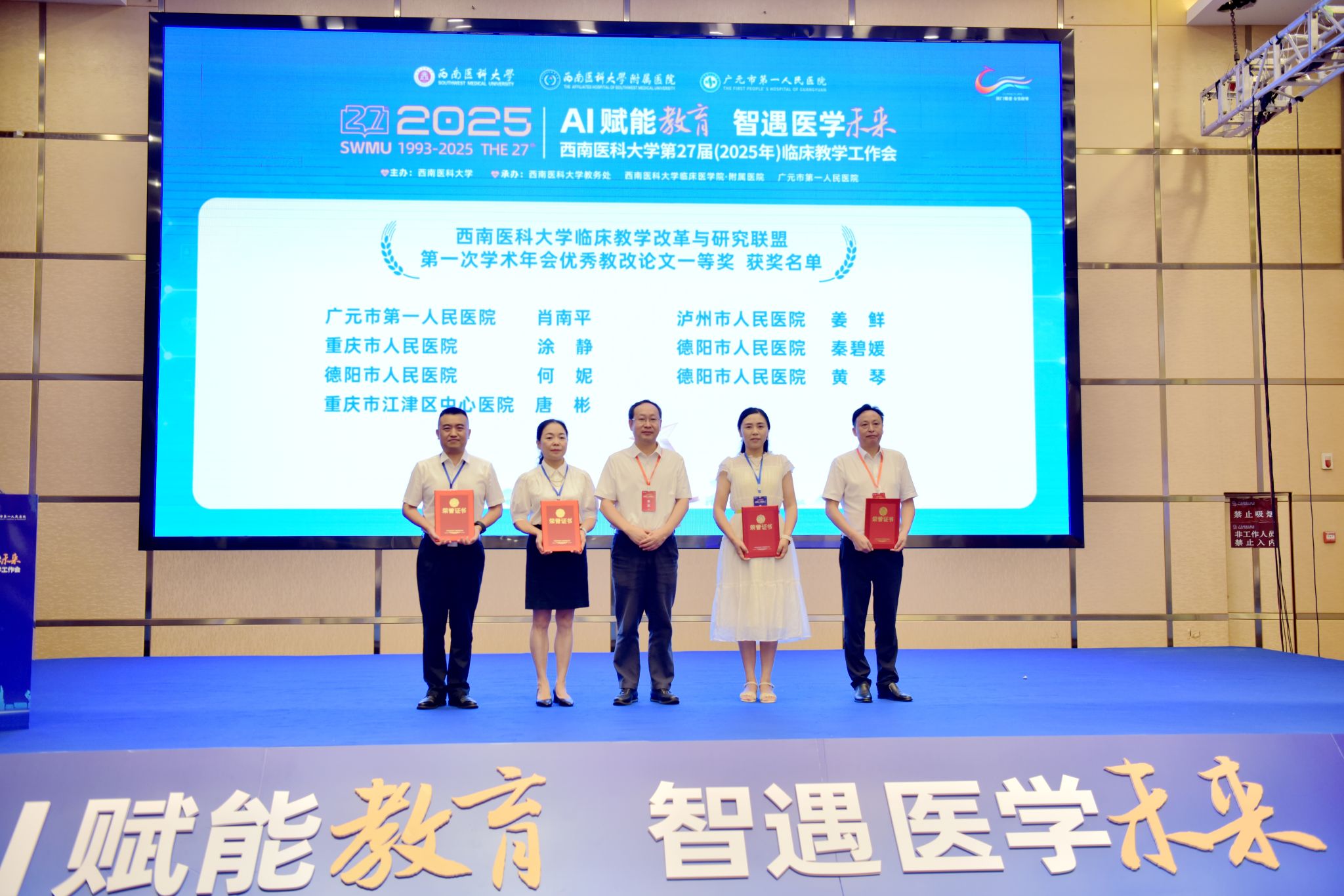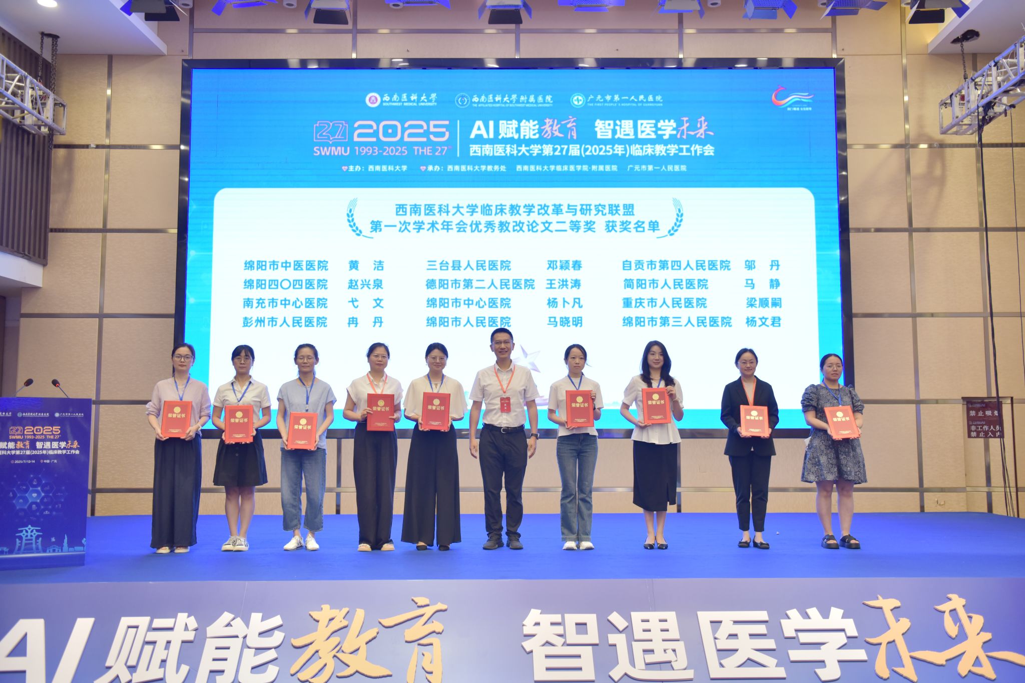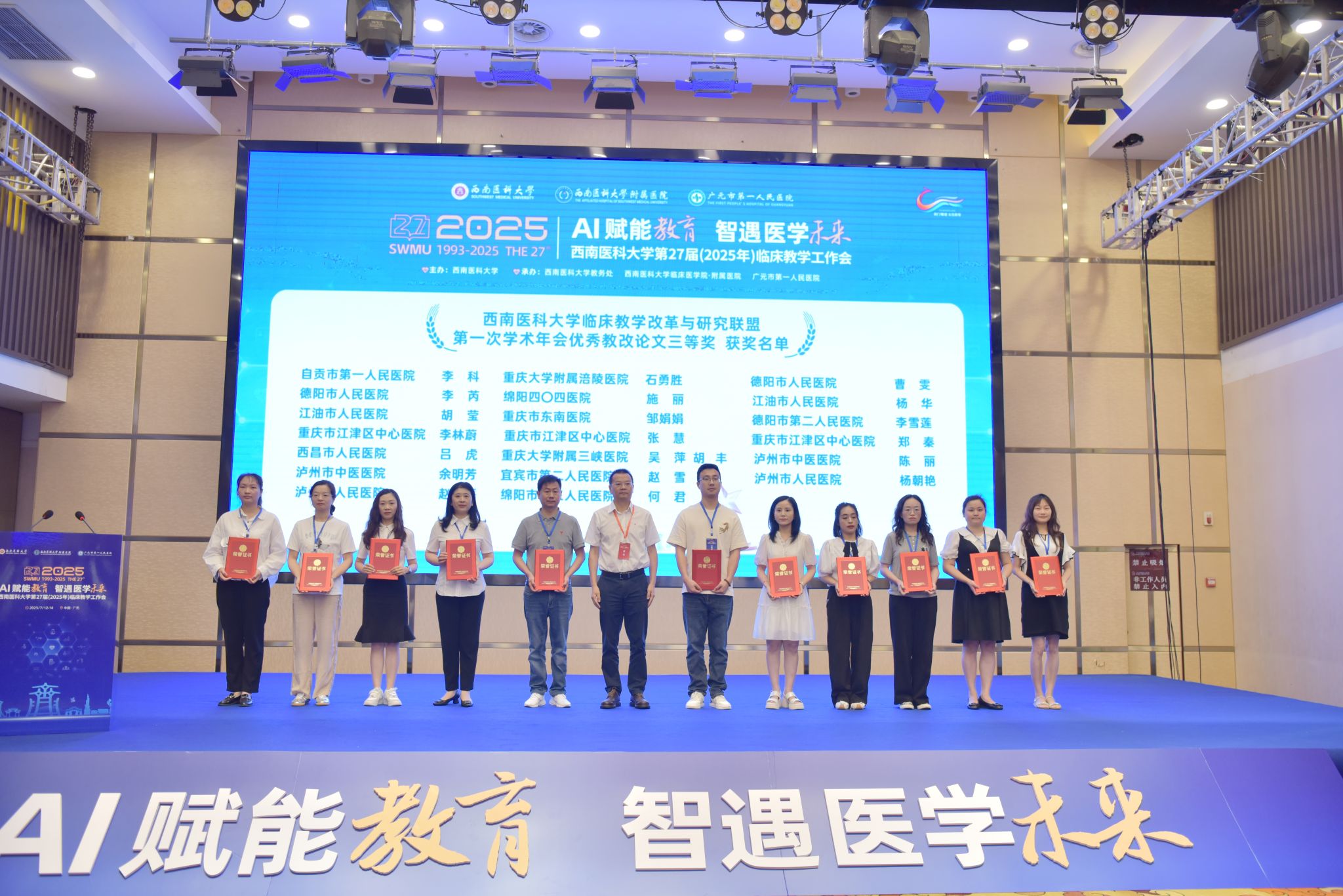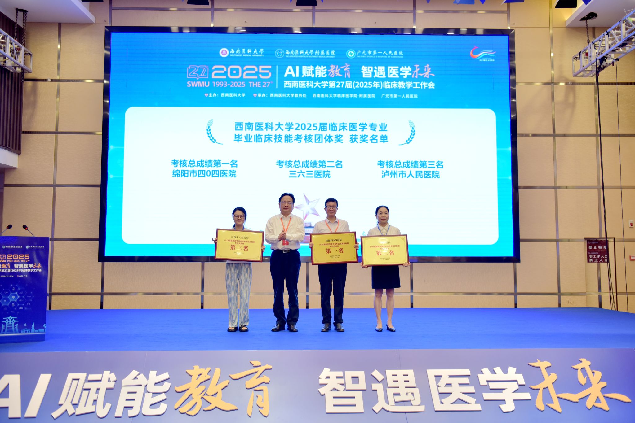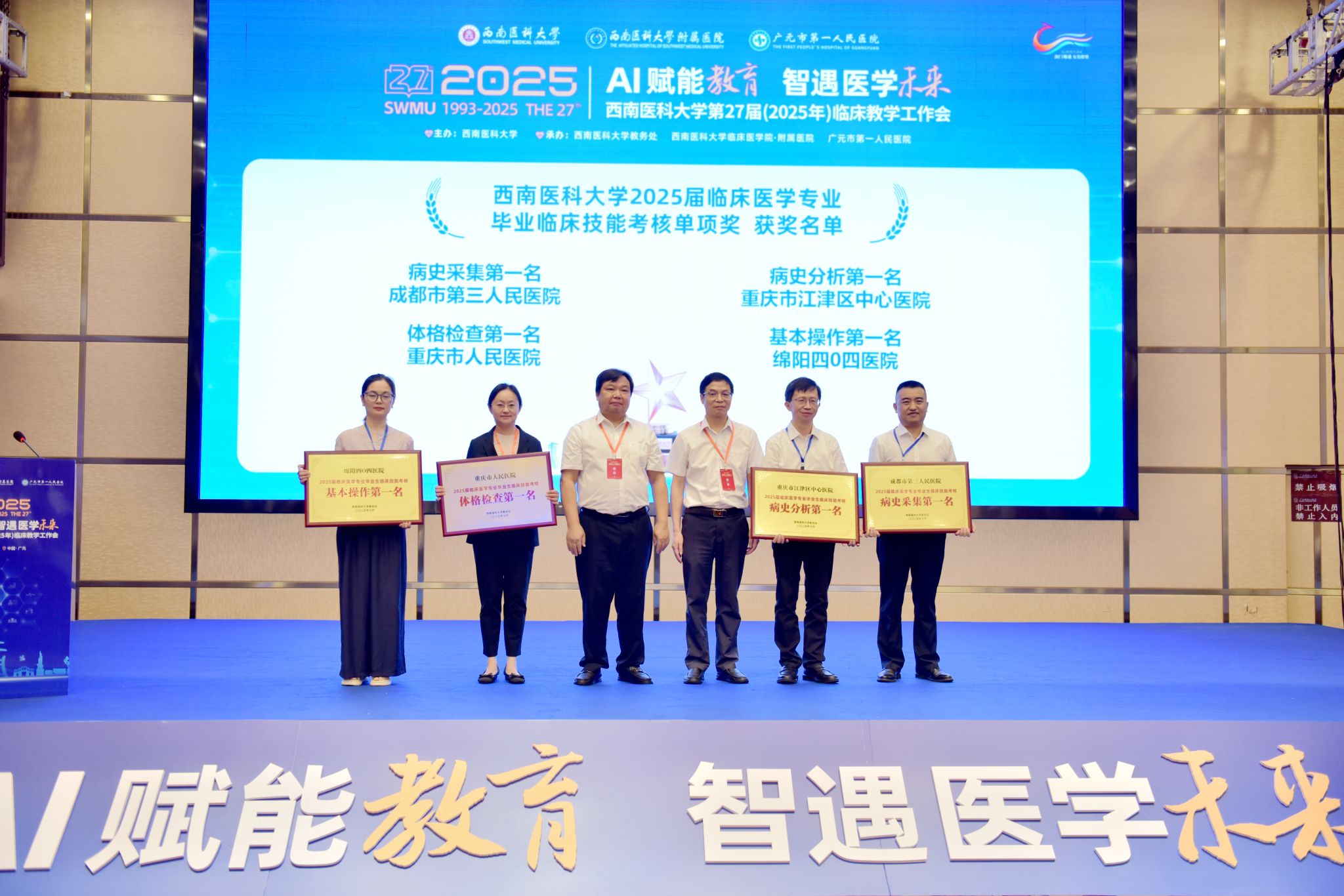 颁奖环节,蒋通荣宣读2025届临床医学专业临床技能毕业考核获奖名单。张春祥为临床技能毕业考核总成绩前三名的单位(绵阳市四0四医院、三六三医院、泸州市人民医院)颁奖;边恩元及王天勋分别为病史采集第一名成都市第三人民医院,病史分析第一名重庆市江津区中心医院,体格检查第一名重庆市人民医院,基本操作第一名绵阳四0四医院颁奖。
