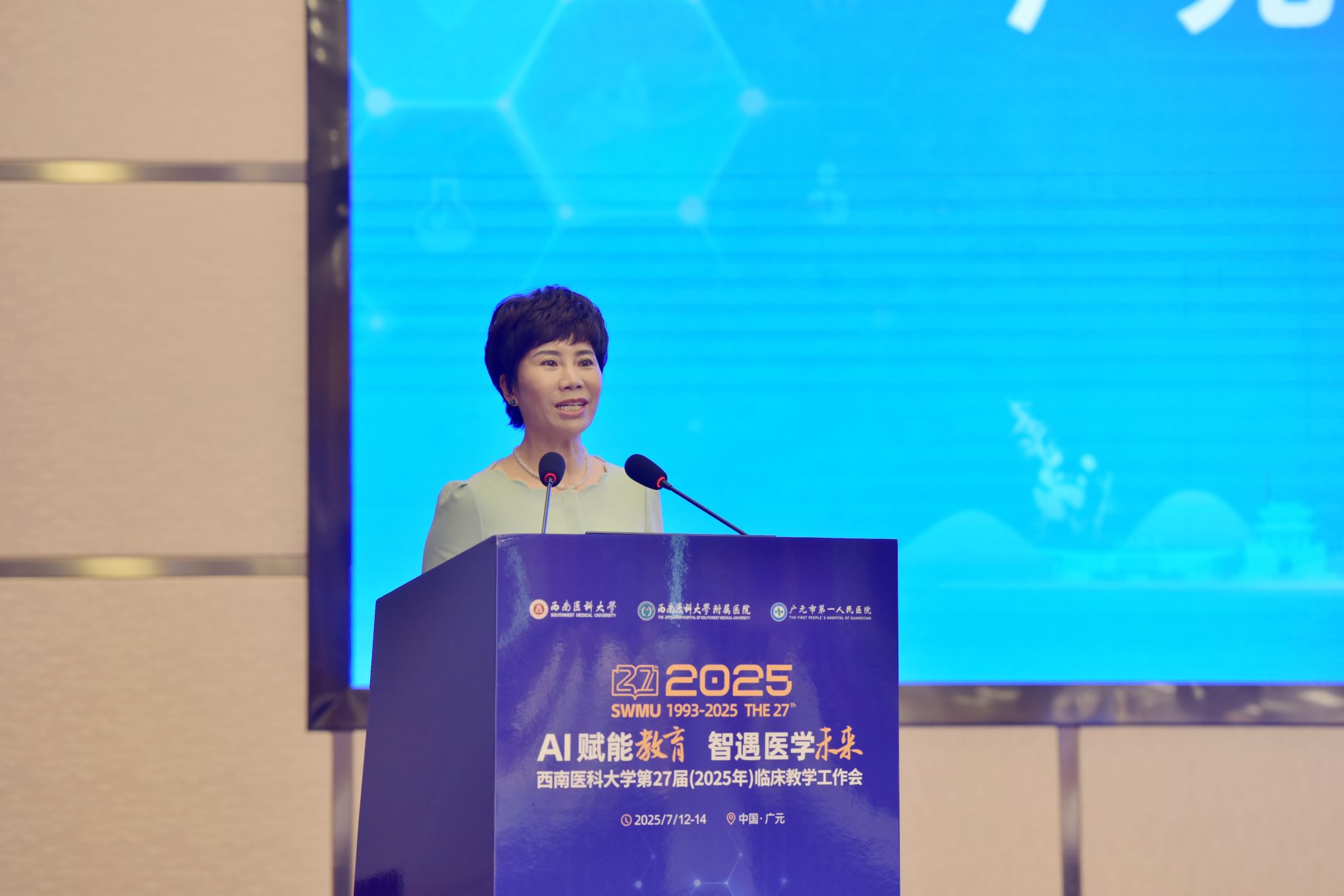 刘素英致辞。她感谢学校长期以来对广元市卫生健康事业的支持,表示本次会议既是对广元医学教育工作的肯定,更是一次难得的学习提升机会,广元市委、市政府将一如既往地全力支持学校医学教育事业的发展。
