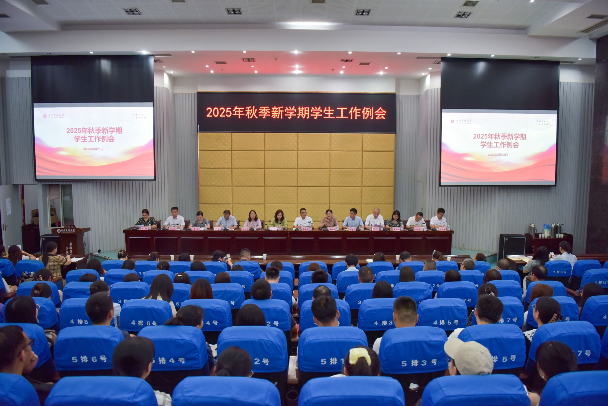 8月28日下午,学校在城北第二学术报告厅召开2025年秋季新学期学生工作例会。学校党委副书记蒋通荣出席,党政办、宣传部、学工部、团委、教务处、保卫处、财务管理处、基建后勤处、信息与教育技术中心等部门领导、各二级院系全体专兼职辅导员等150余人参加了会议。会议由学生工作部部长谭群英主持。