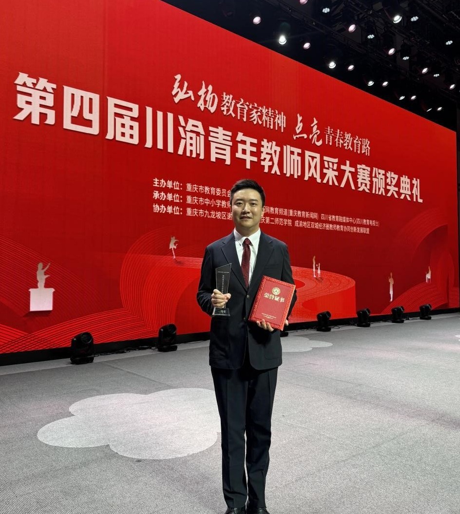 自大赛启动以来,刘孟楠老师先后通过校内选拔、四川省省级复赛,以扎实的教学功底、生动的育人实践和出色的综合素养,成功晋级川渝两地区总决赛。827日,在重庆第二师范学院举行的总决赛中,面对现场随机抽题答辩等考验,刘孟楠老师凭借深厚的知识储备、敏捷的应变能力与清晰的逻辑表达,展现出专业的教学水准与崇高的育人情怀,赢得了评委们的高度认可。