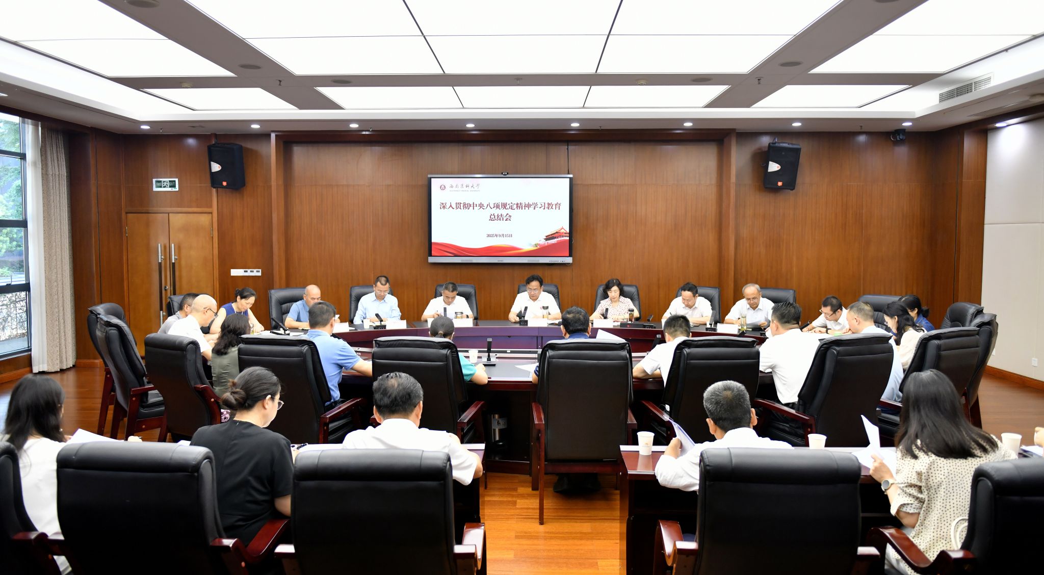 915日,学校在城北校区一会议室召开深入贯彻中央八项规定精神学习教育总结会。全体在校校领导、二级党组织书记、学习教育工作专班相关同志参加会议。校党委副书记蒋通荣主持会议。