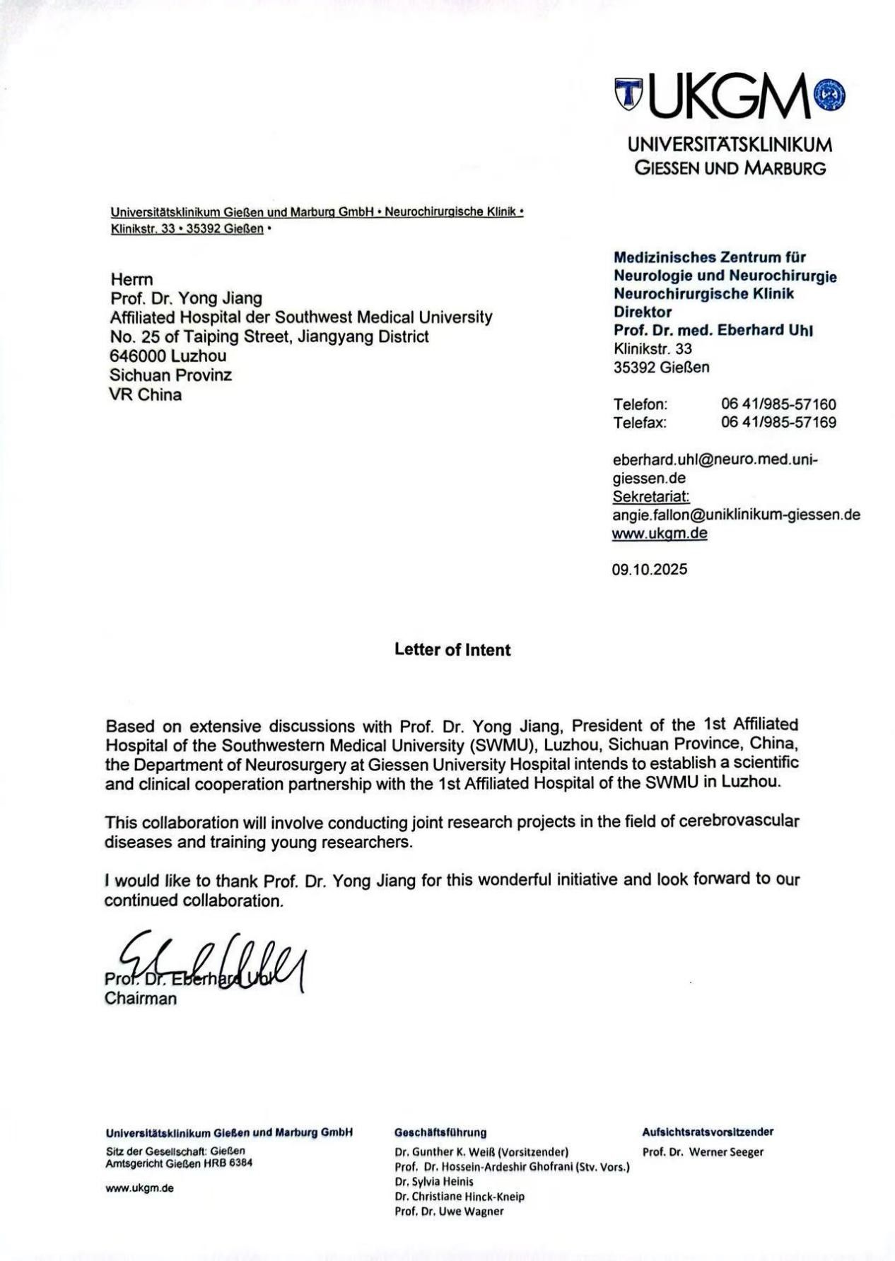 同时,德国吉森大学附属医院(Universitätsklinikum Gießen und Marburg)近日正式发文,拟在脑血管疾病的研究和人才培养上与医院神经外科开展紧密的国际合作。