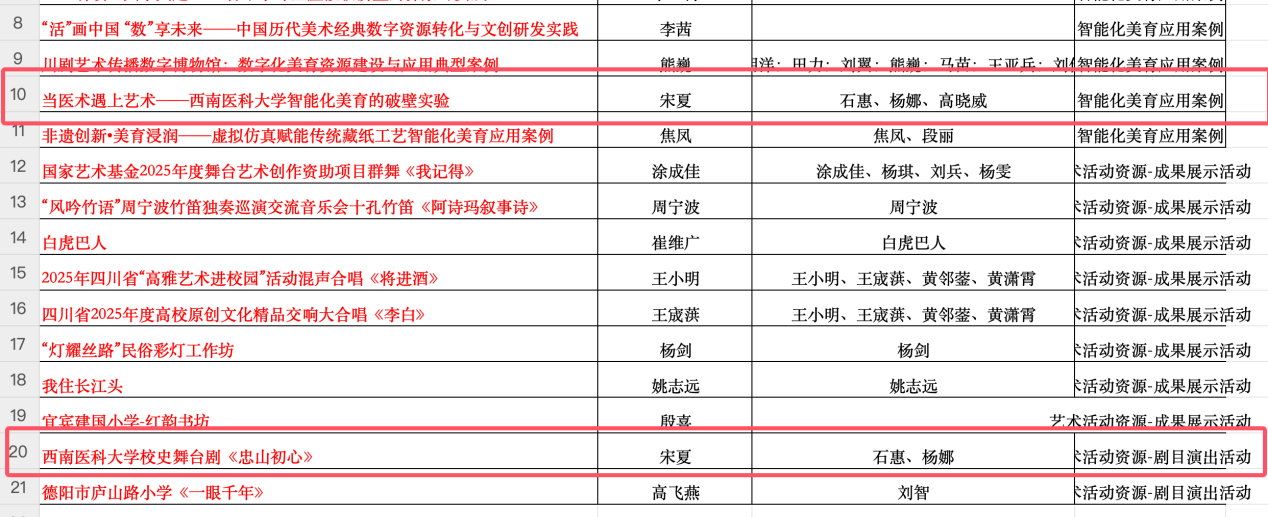 日前,四川省教育厅公布全省2025年度数字化美育资源和智能化美育应用案例入选名单。校团委牵头申报的《kaiyun官方网站入口校史舞台剧——忠山初心》和《当医术遇上艺术——kaiyun官方网站入口智能化美育的破壁实验》2个项目,经专家论证,分别被认定为优秀“艺术活动资源-剧目演出活动”和“智能化美育应用案例”,并被推荐至教育部国家智慧教育平台。