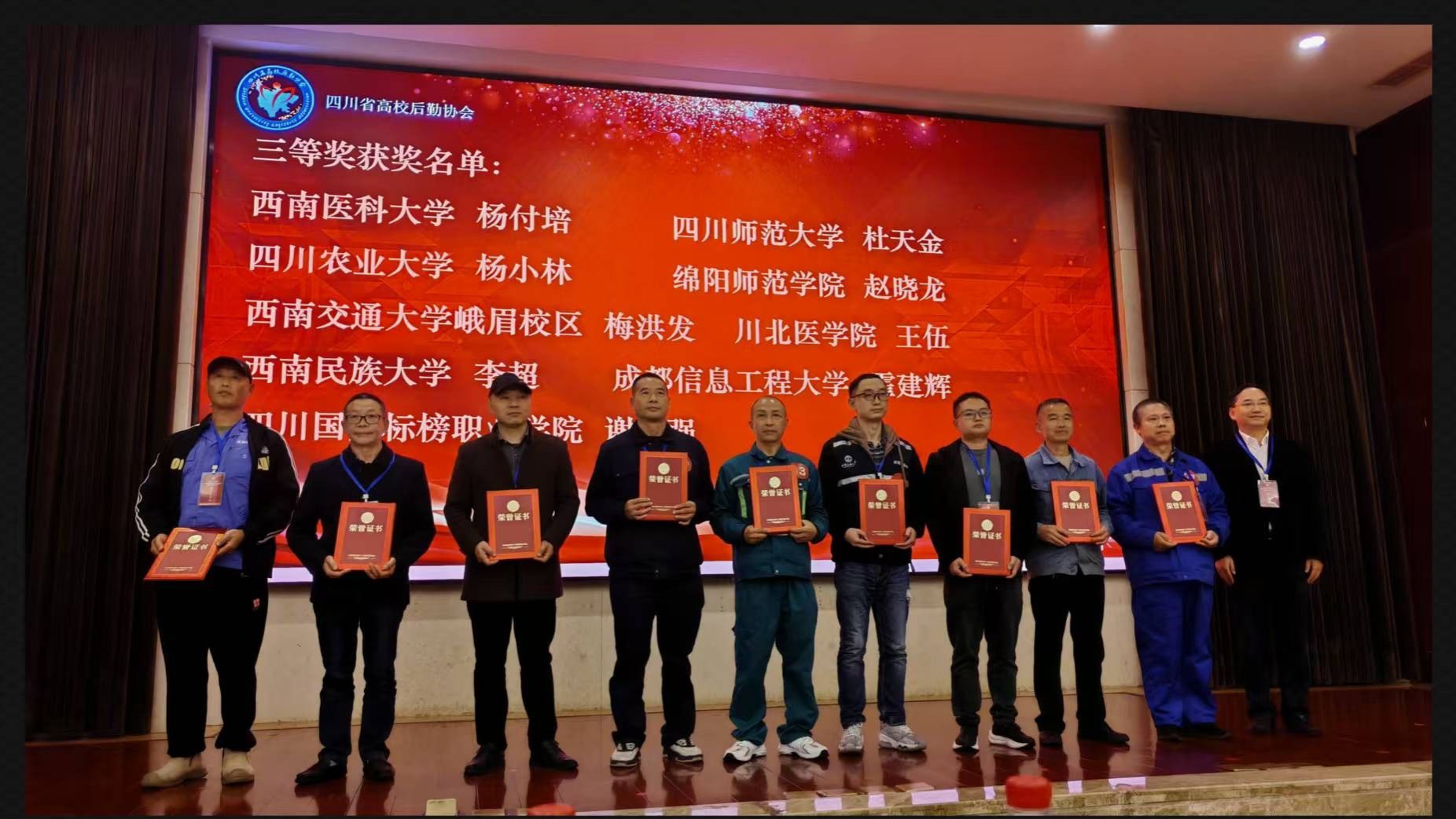 近日,四川省高校后勤协会在西南交通大学峨眉校区举办了全省高校后勤物业与绿化员工技能培训暨技能大赛,全省共28所高校参赛。通过激烈比拼,kaiyun官网基建后勤处员能源维修科员工杨传奇获得电工组个人二等奖,物业管理科员工杨付培获得绿化组个人三等奖,基建后勤处代表学校获得团体奖一等奖。