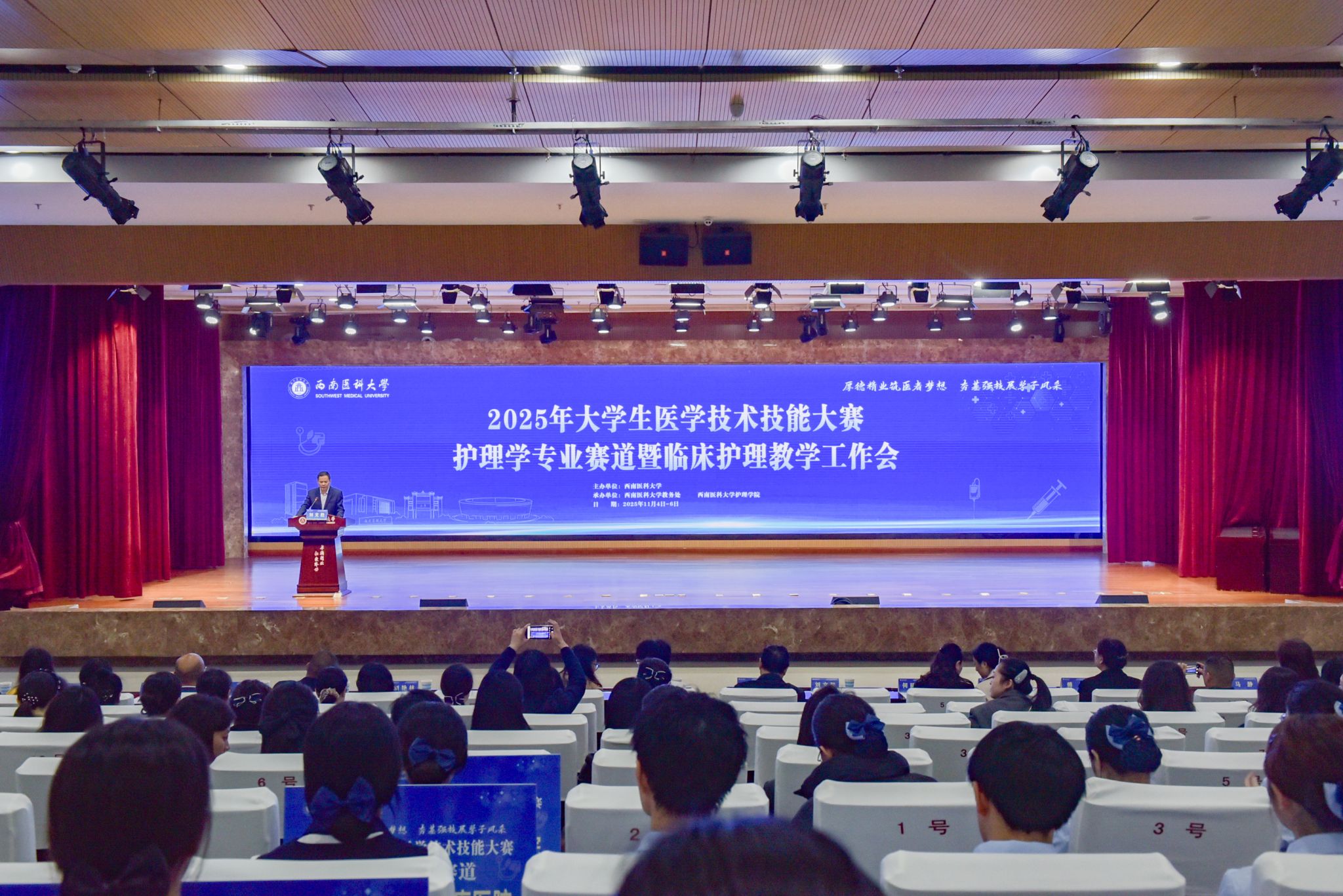 11月5日上午,大赛开幕式在城北校区第一学术报告厅举行,护理学院党委书记刘文胜主持。学校党委常委、副校长聂敏海,教务处(高教研究所)副处长汤军、实验与实践教学管理科副科长吴桐,护理学院班子成员、骨干教师及各教学基地领队、指导教师、参赛学生出席。聂敏海在致辞中指出,该校护理专业为国家一流专业建设点、四川省“双一流”建设学科,希望以大赛为契机深化各教学医院交流,协同提升教学质量,服务“健康中国”“教育强国”战略。随后,裁判员代表罗珊、参赛选手代表周硕分别宣誓,承诺公正执裁、遵规竞技。