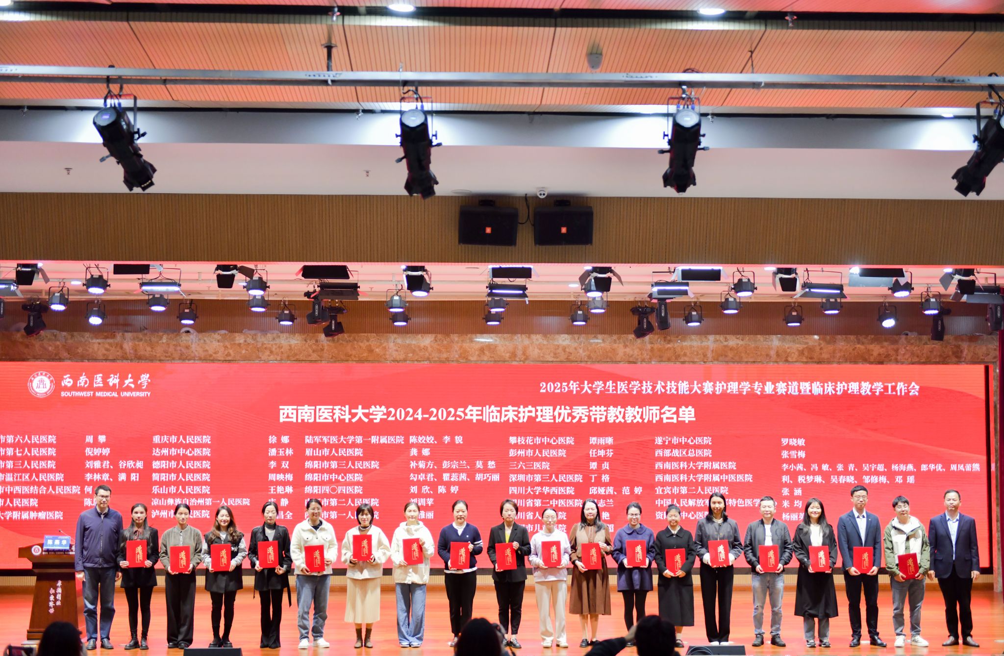 11月5日下午,大赛闭幕式在同一学术报告厅举行,护理学院院长陈燕华主持。学校党委常委、副校长周翔宇,教务处(高教研究所)副处长雷小平、实验与实践教学管理科科长郭志成及各教学基地代表、裁判员、参赛选手参会。总裁判长陈丽总结点评时表示,本次大赛考点规范、流程清晰,参赛队伍展现了扎实功底。雷小平、刘文胜分别宣读比赛结果及优秀带教教师名单,与会领导为获奖代表颁奖。最终评选出团体一等奖3个(宜宾市第二人民医院等)、二等奖8个(绵阳四0四医院等)、三等奖16个(内江市第一人民医院等)、优秀组织奖1个;成都市温江区人民医院钟雪晴等获18项单项奖;成都市第六人民医院周攀等55名教师获评优秀带教教师。周翔宇在总结中肯定大赛成效,强调学校将与各教学医院携手创新医教协同机制,共促医学人才培养。