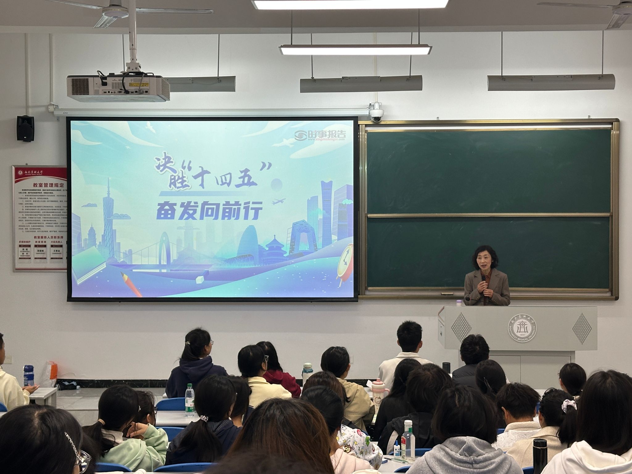 授课中,何涛深入地阐述了我国十四五以来取得的辉煌发展成就。她指出,在党的坚强领导下,亿万人民以时不我待的紧迫感狠抓落实,用改革创新的思路与方法破解发展难题,将各方面积极因素凝聚转化为实实在在的发展成果,最终以昂扬奋进的姿态,书写了一份令人满意的十四五收官答卷。随后,她重点解读了党的二十届四中全会对全面深化改革、推进国家治理体系和治理能力现代化作出的新部署,并介绍了十五五时期经济社会发展的指导思想、主题主线和目标要求,让学生深刻地认识到中国式现代化将展开更加壮美的画卷、呈现更加光明灿烂的前景。最后,何涛紧密结合医学专业特点,通过详实的数据与生动的案例,引导同学们深刻的理解国家发展与个人学业、未来职业之间的紧密联系,鼓励大家将个人理想融入国家发展大局当中,让青春的底色更加厚重。