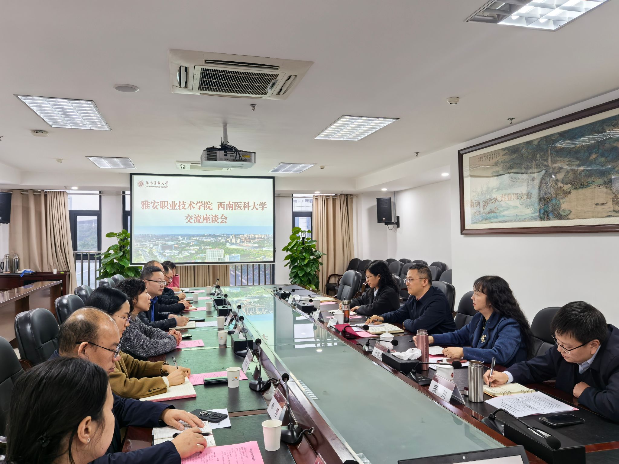 1110日,雅安职业技术学院党委副书记、校长黄诚,党委常委、副校长付洪涛,党委委员、组织部部长、人事处处长刘永恩,临床医学院(附属医院)院长张川,基建后勤处副处长李垒一行5人来校交流。座谈交流会在城北校区德诚楼521会议室举行,学校党委副书记、校长何涛,组织部、人事处、研究生院、基建后勤处、临床医学院相关领导参加了会议,会议由学校研究生工作部·研究生院部(院)长罗茂主持。